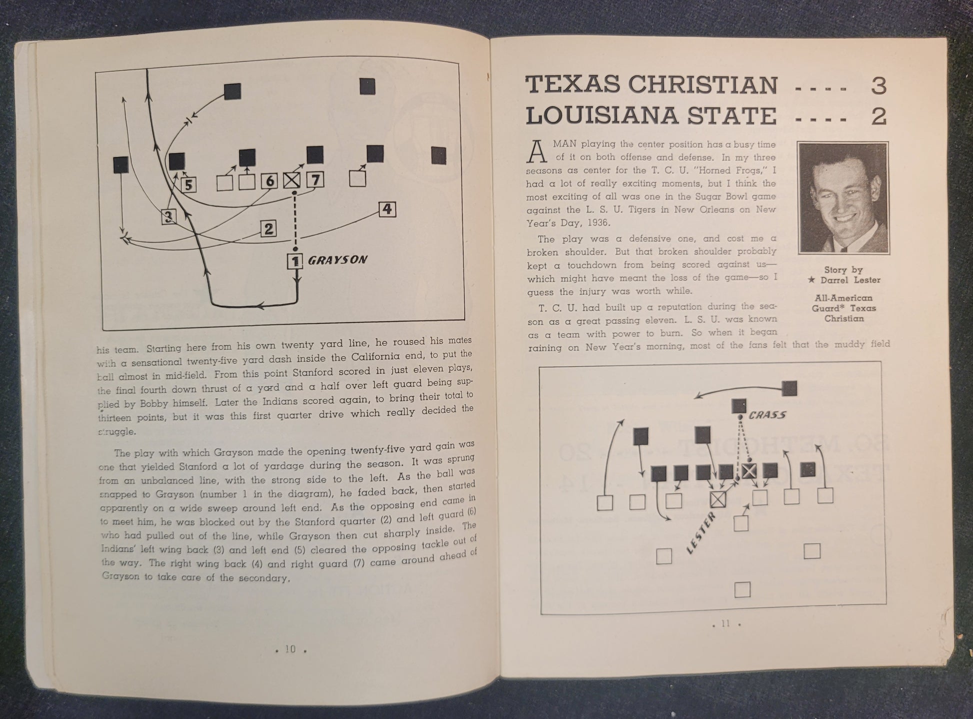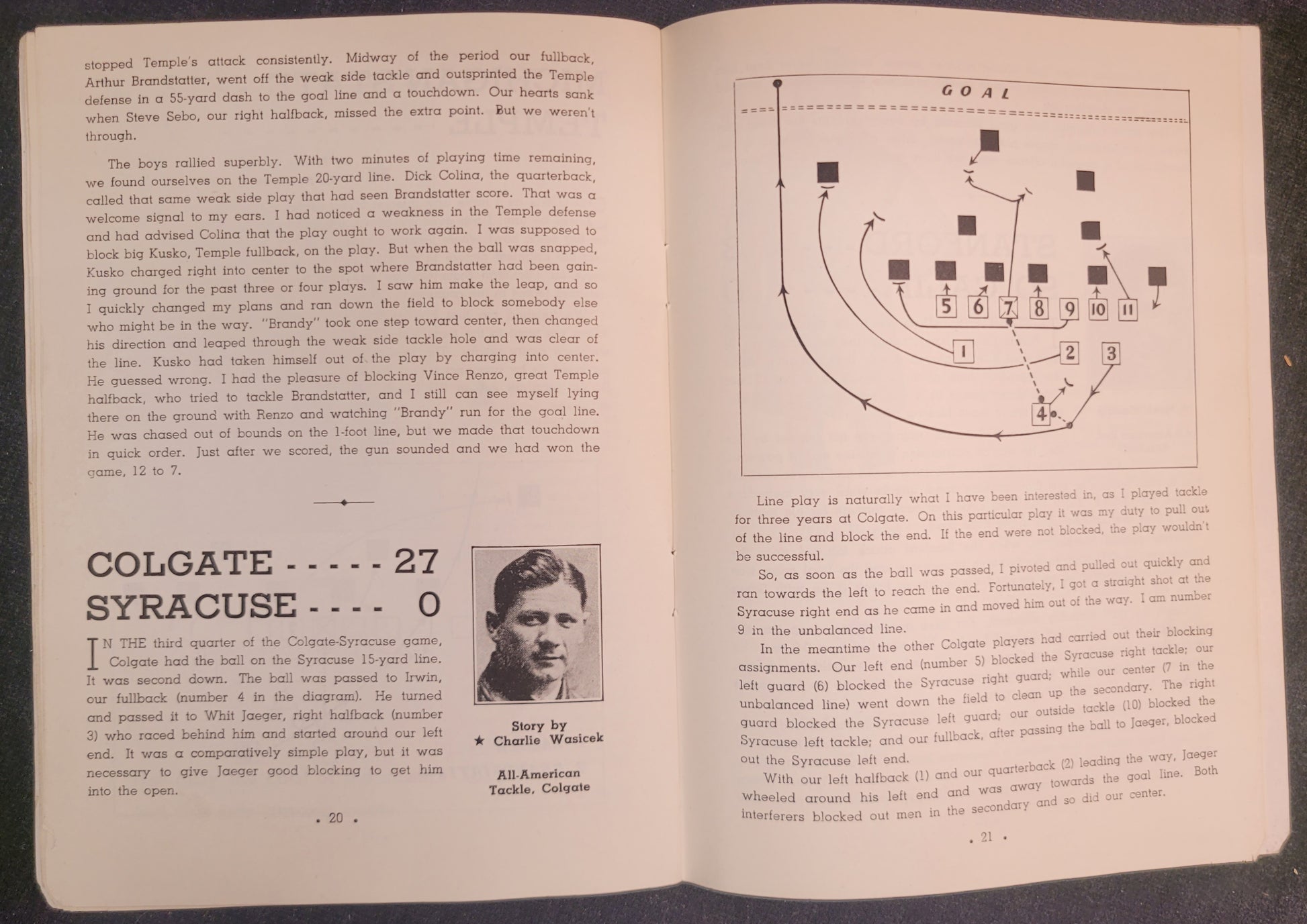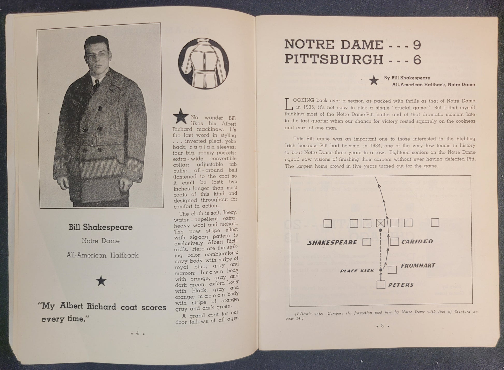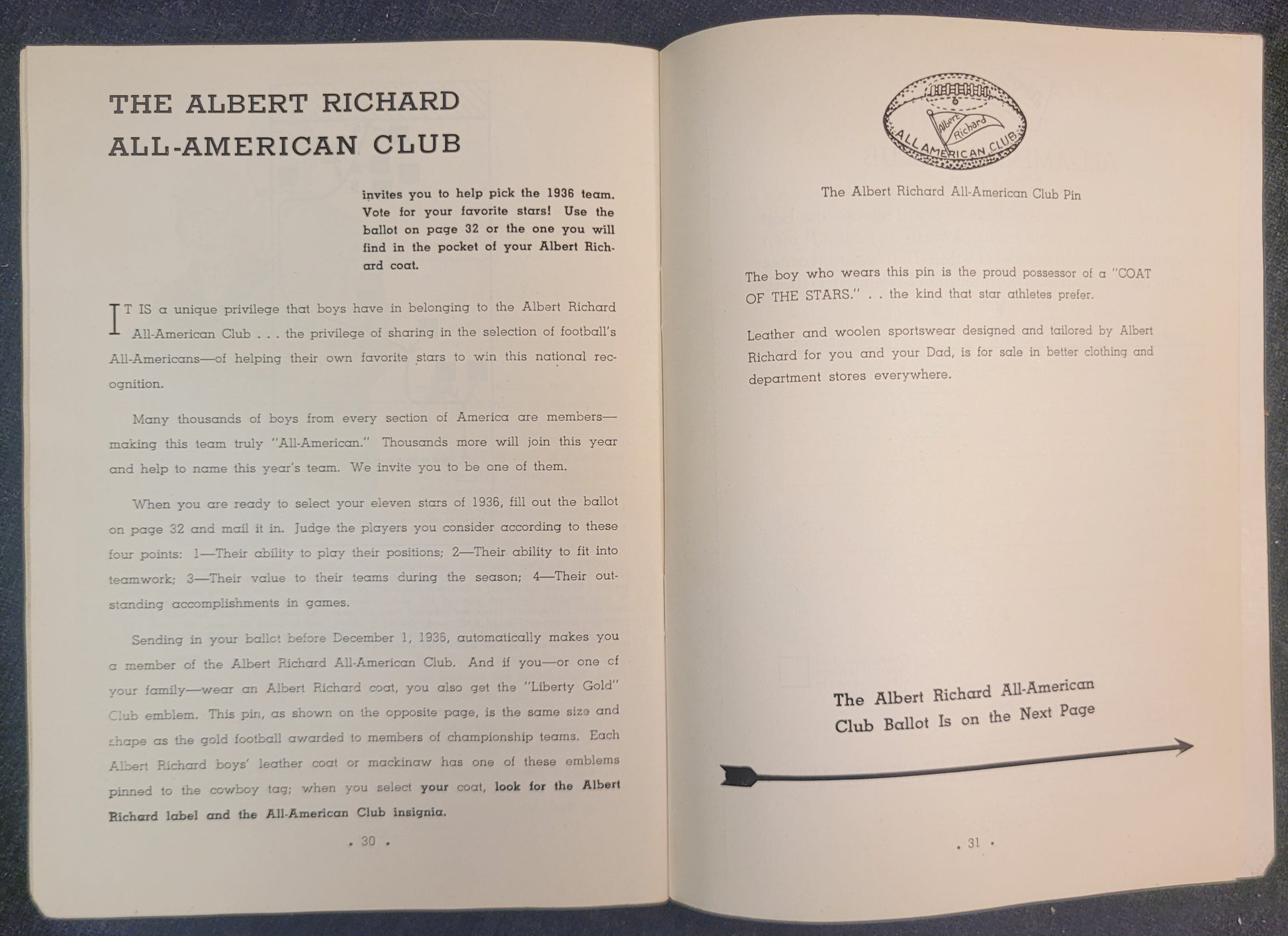 This booklet details some of the most important games during the 1935 football season, and what the players and coaches did to win them. It was published by the Albert Richard company in 1936. The company started as a division of the Fried-Ostermann Company, a glove manufacturer, of Milwaukee, Wisconsin. Albert Richard produced leather and sportswear and quickly outgrew Fried-Ostermann. The company was eventually sold in the mid 1950s.