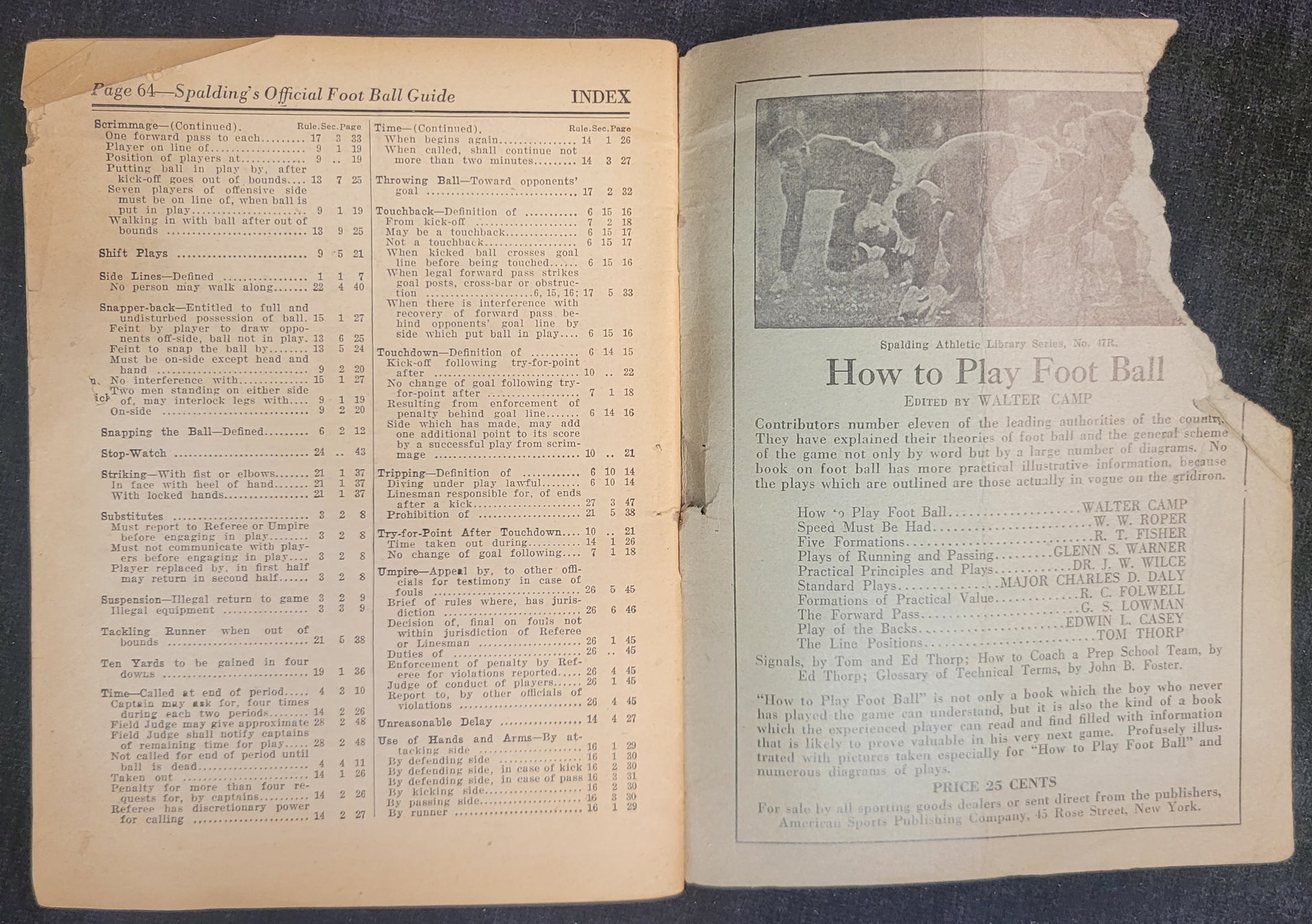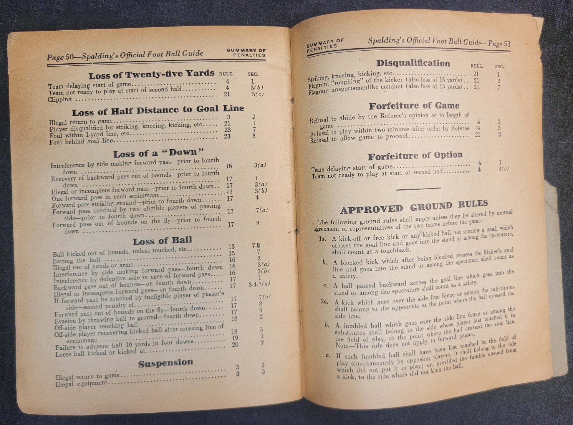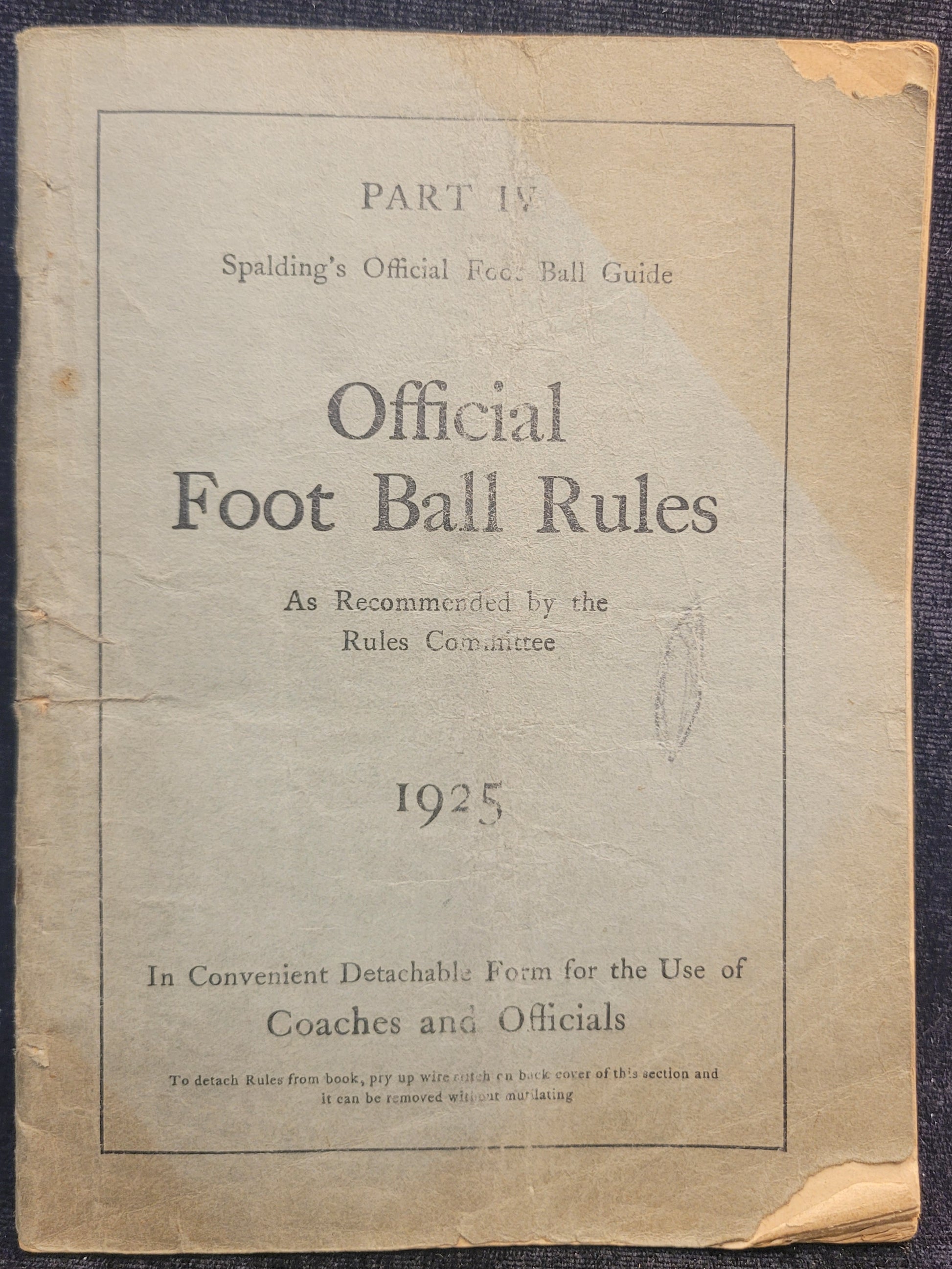 This 1925 edition of Spalding's football rules and guide book is in fairly good condition. There is some tearing and soft corners as well s age related discoloration.