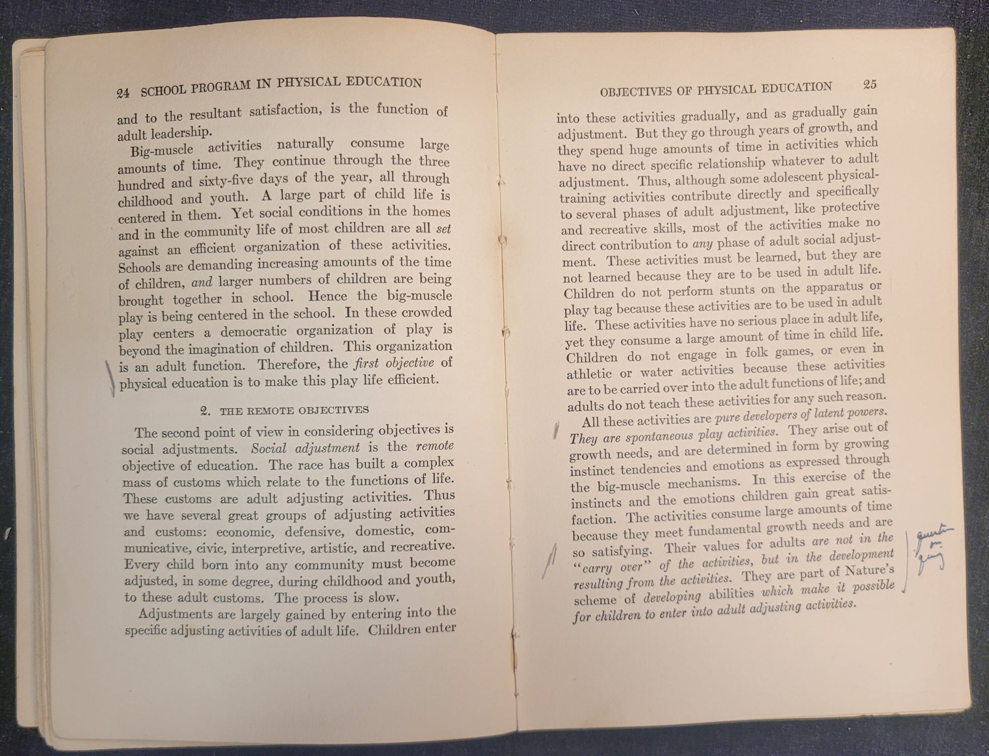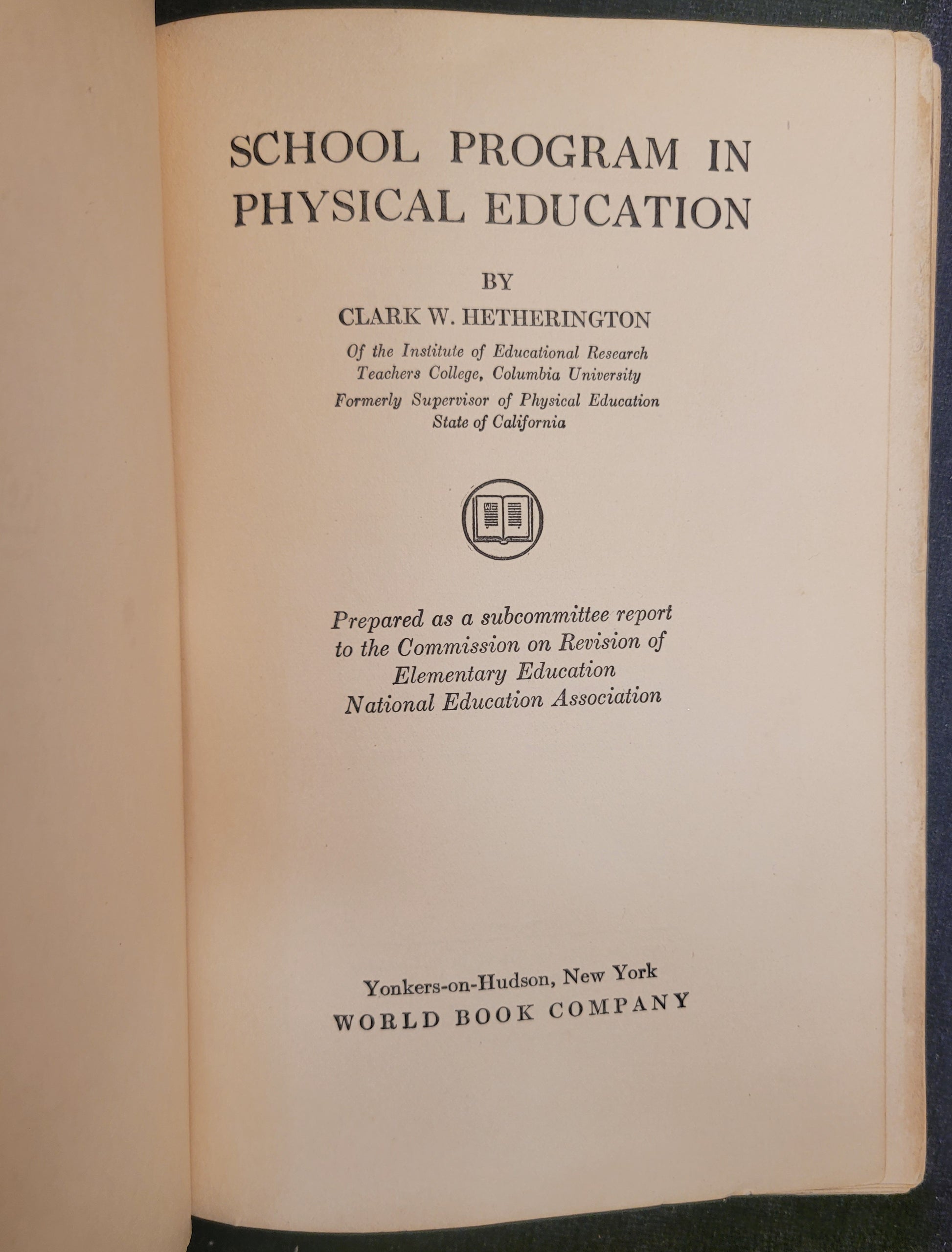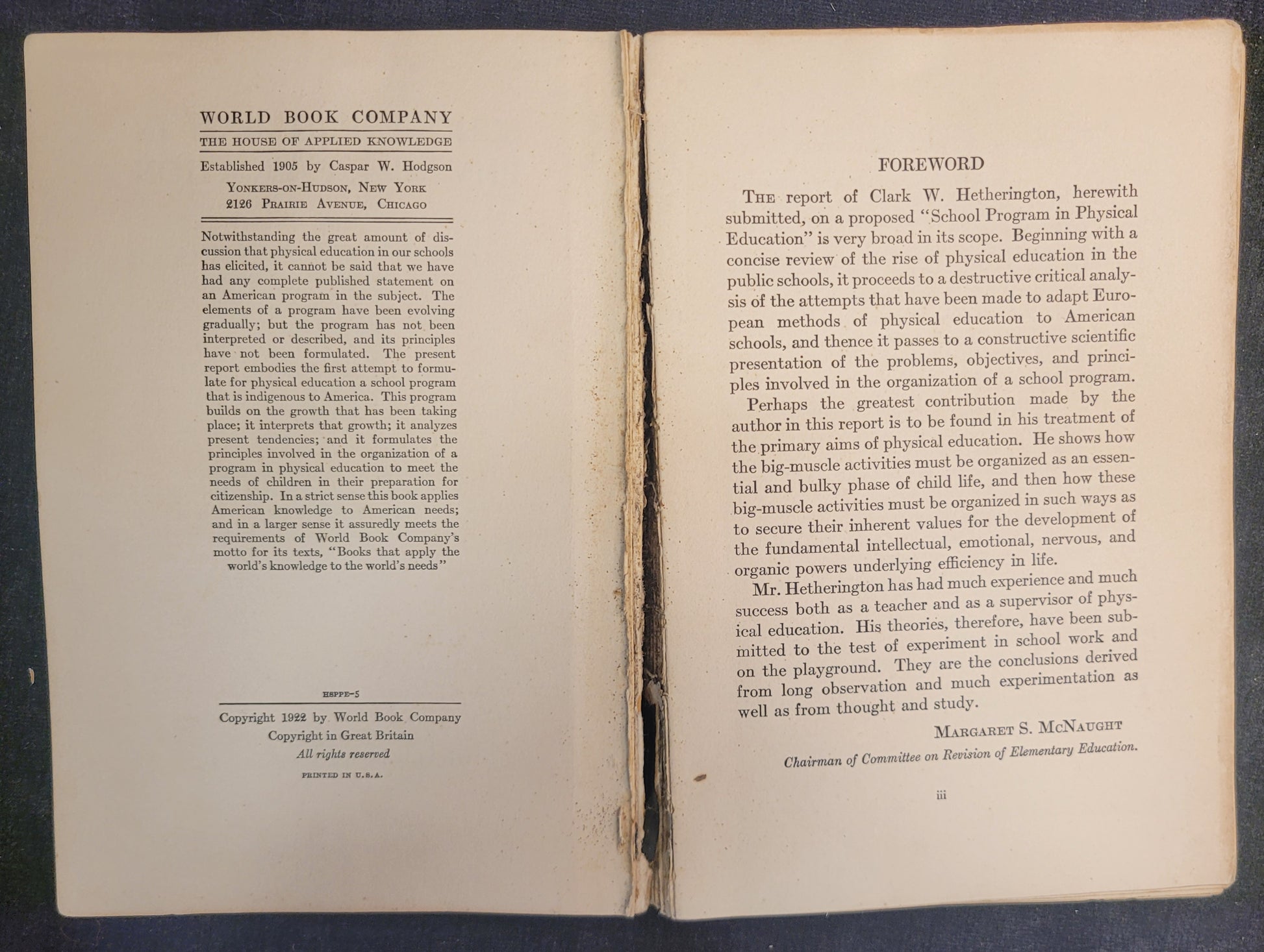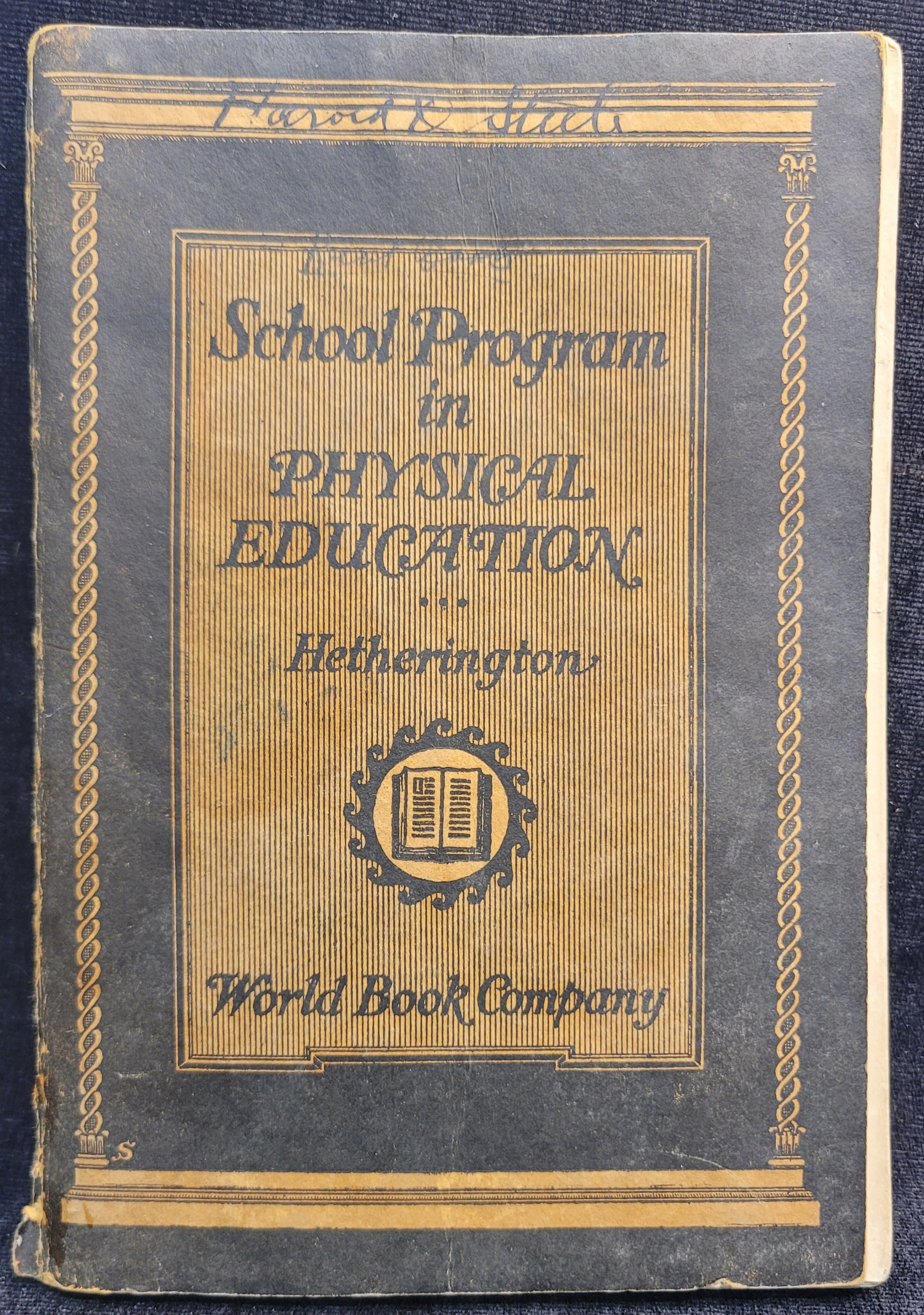 This copy of Hetherington's teaching guide was well loved and well annotated by its previous owner, Harold O Steele. Steele played football for the University of Michigan from 1921-1923, and later coached in Grand Rapids, MI. The interior of both the front and back covers are covered in notes, and there are plenty of underlines and annotations throughout the chapters. The book is in fairly good condition, showing signs of wear and tear and discoloration, but is not torn or missing pages.