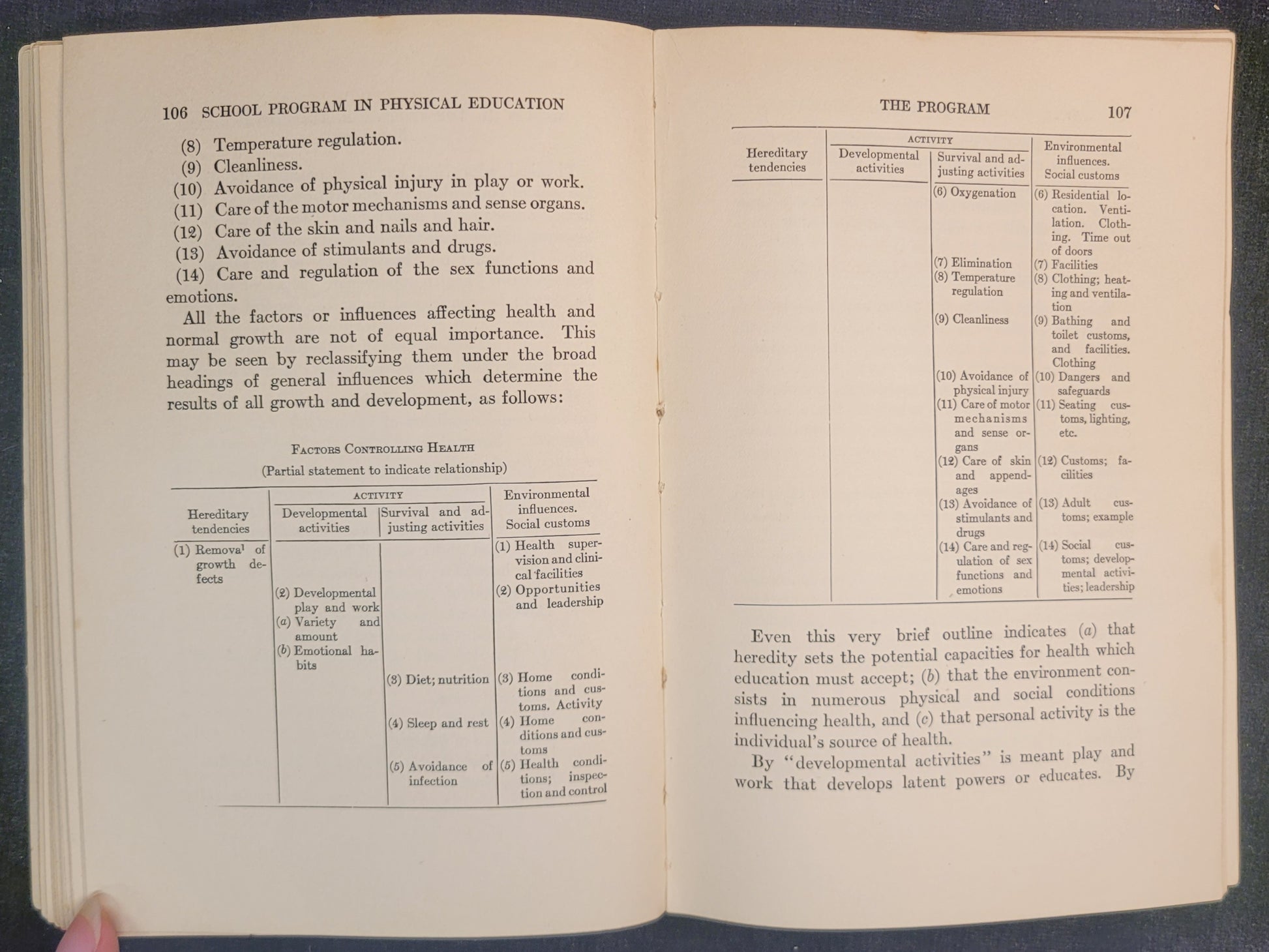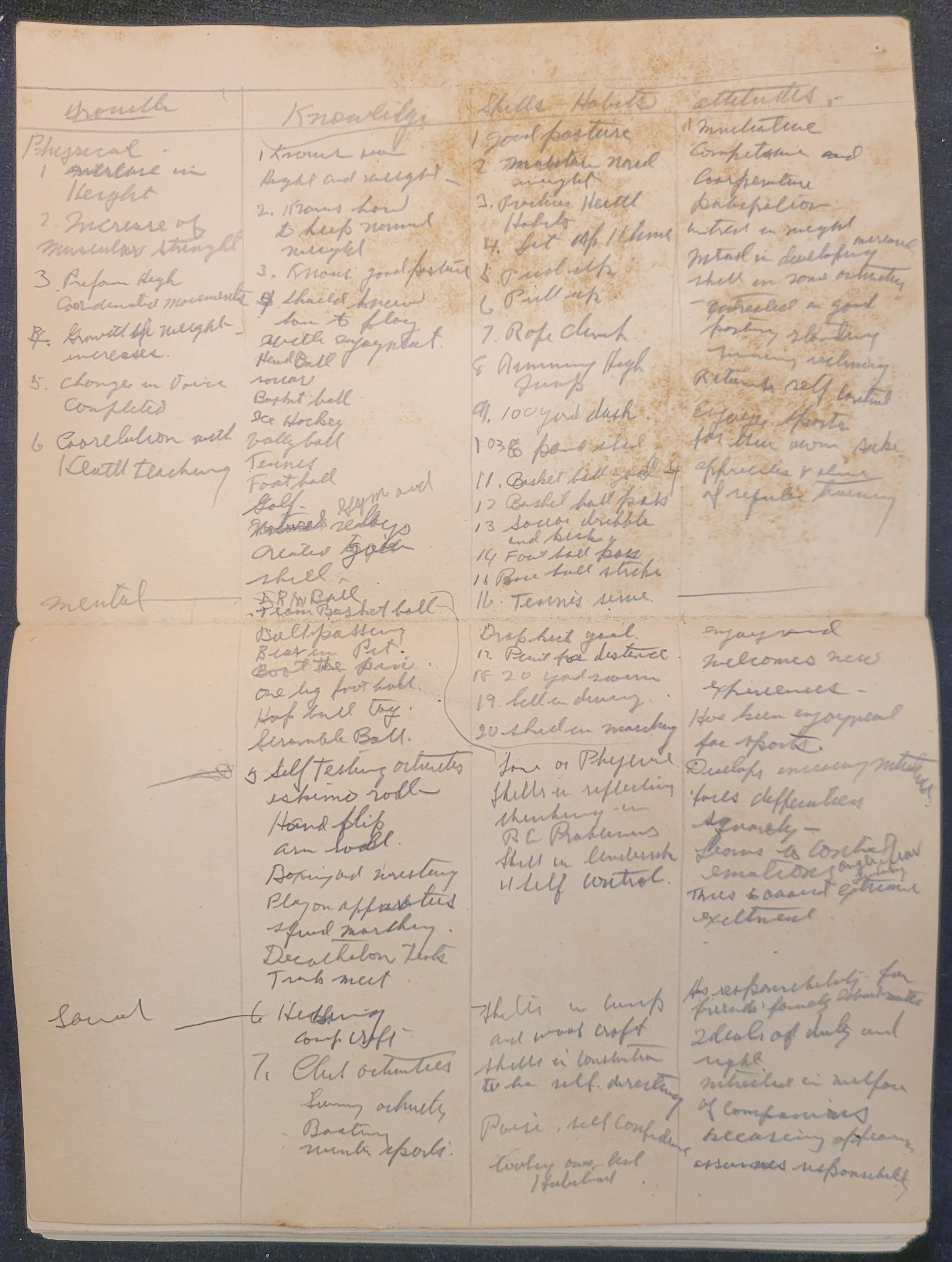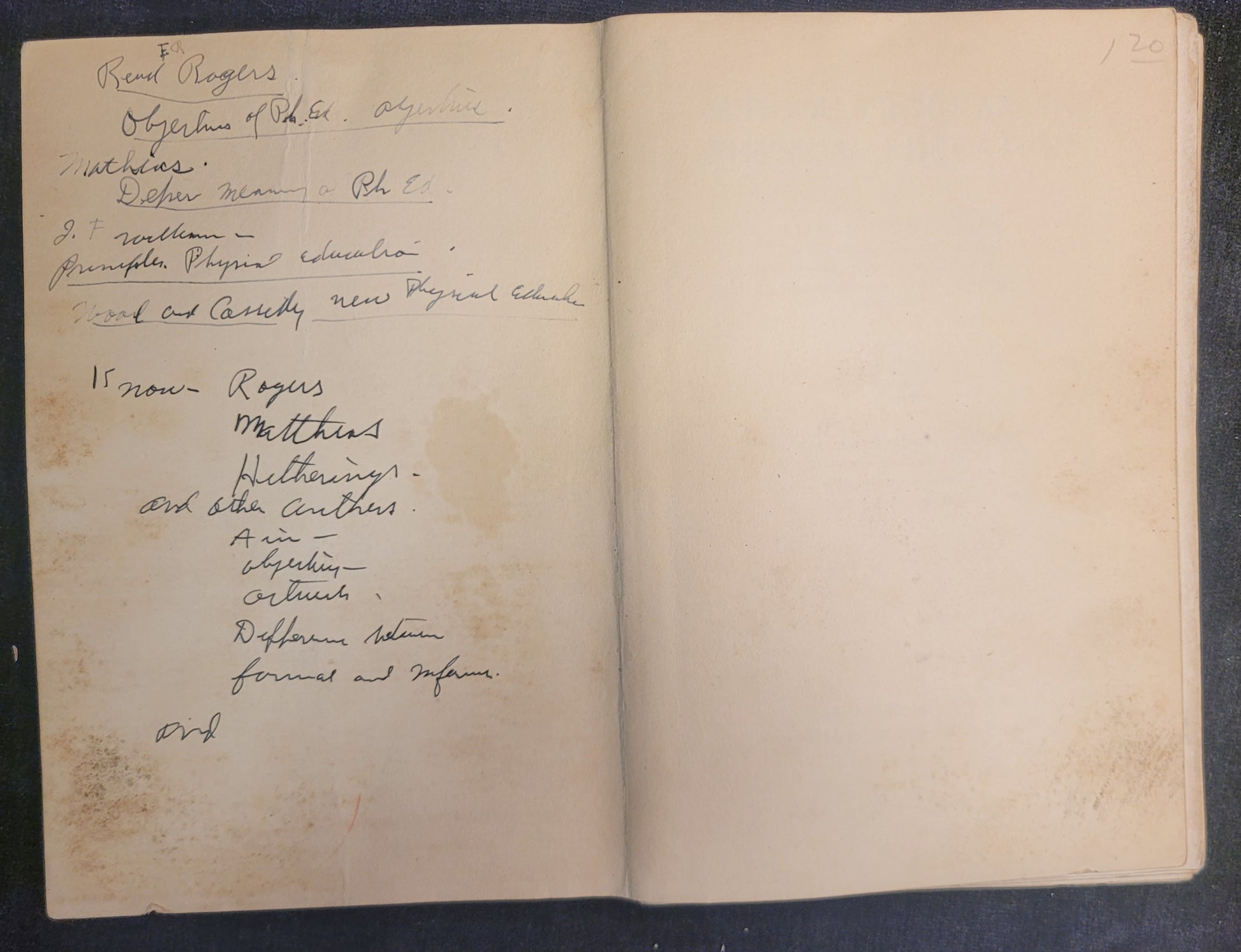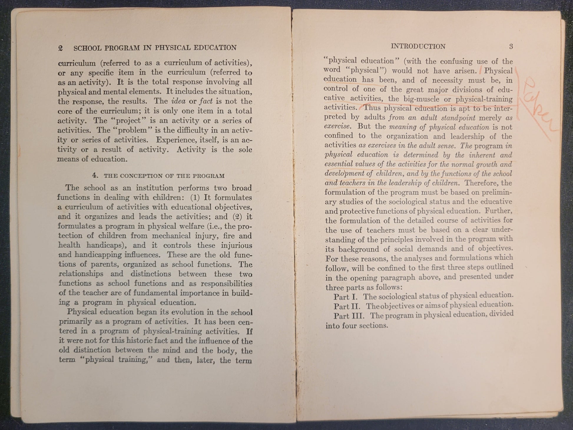 This copy of Hetherington's teaching guide was well loved and well annotated by its previous owner, Harold O Steele. Steele played football for the University of Michigan from 1921-1923, and later coached in Grand Rapids, MI. The interior of both the front and back covers are covered in notes, and there are plenty of underlines and annotations throughout the chapters. The book is in fairly good condition, showing signs of wear and tear and discoloration, but is not torn or missing pages.