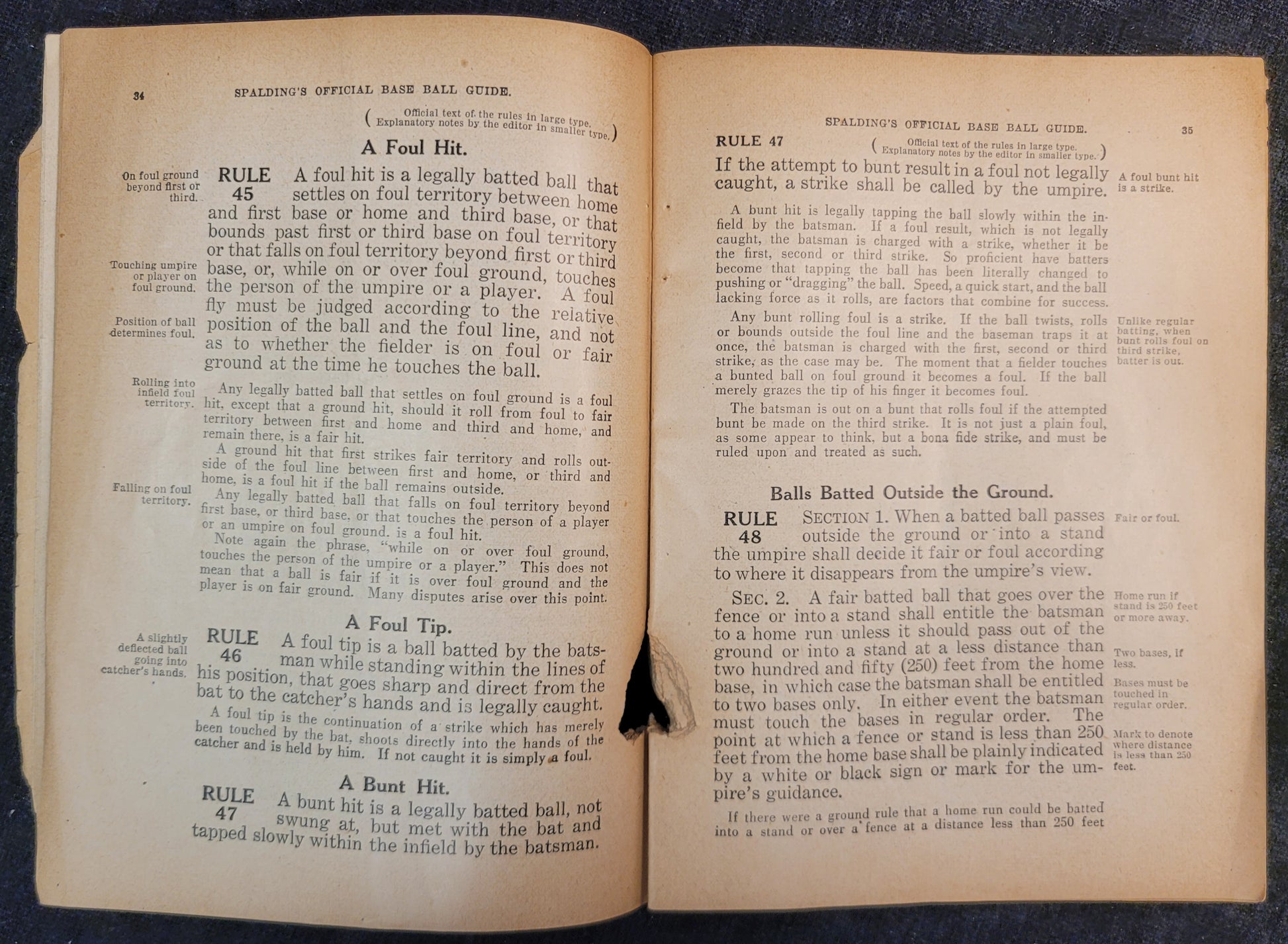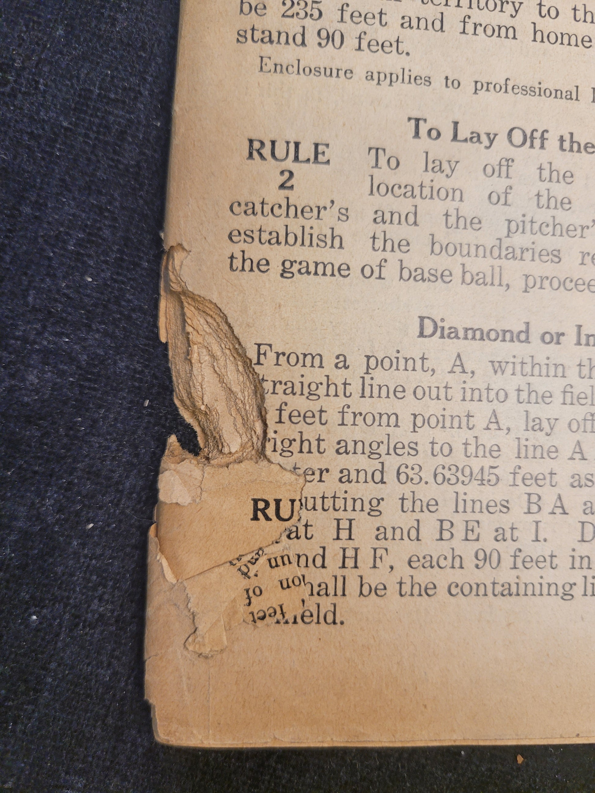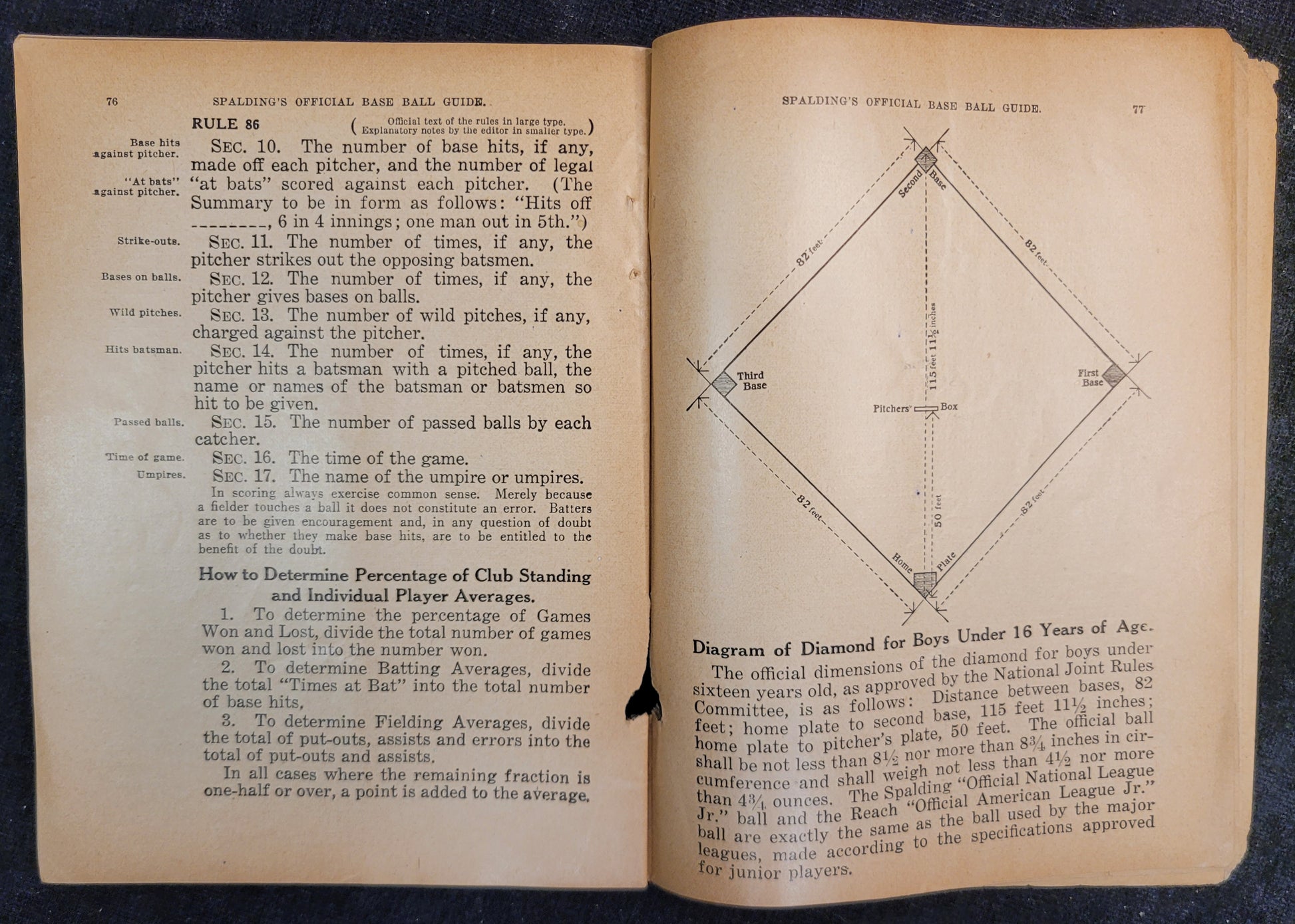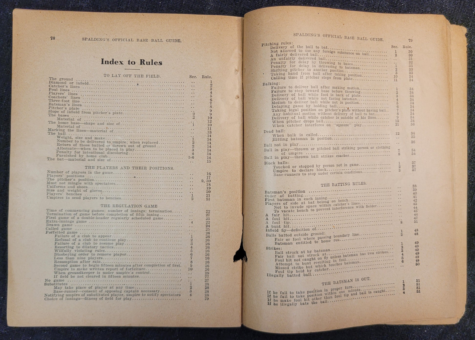 This baseball rule book is most likely from the 1920s based on signs of aging and production style. This copy is missing its cover as well as the first and last page. Rules one through 86, the index, diagrams, hints and stories are all more or less intact. There are signs of mouse damage along the spine and the pages are very brittle.
