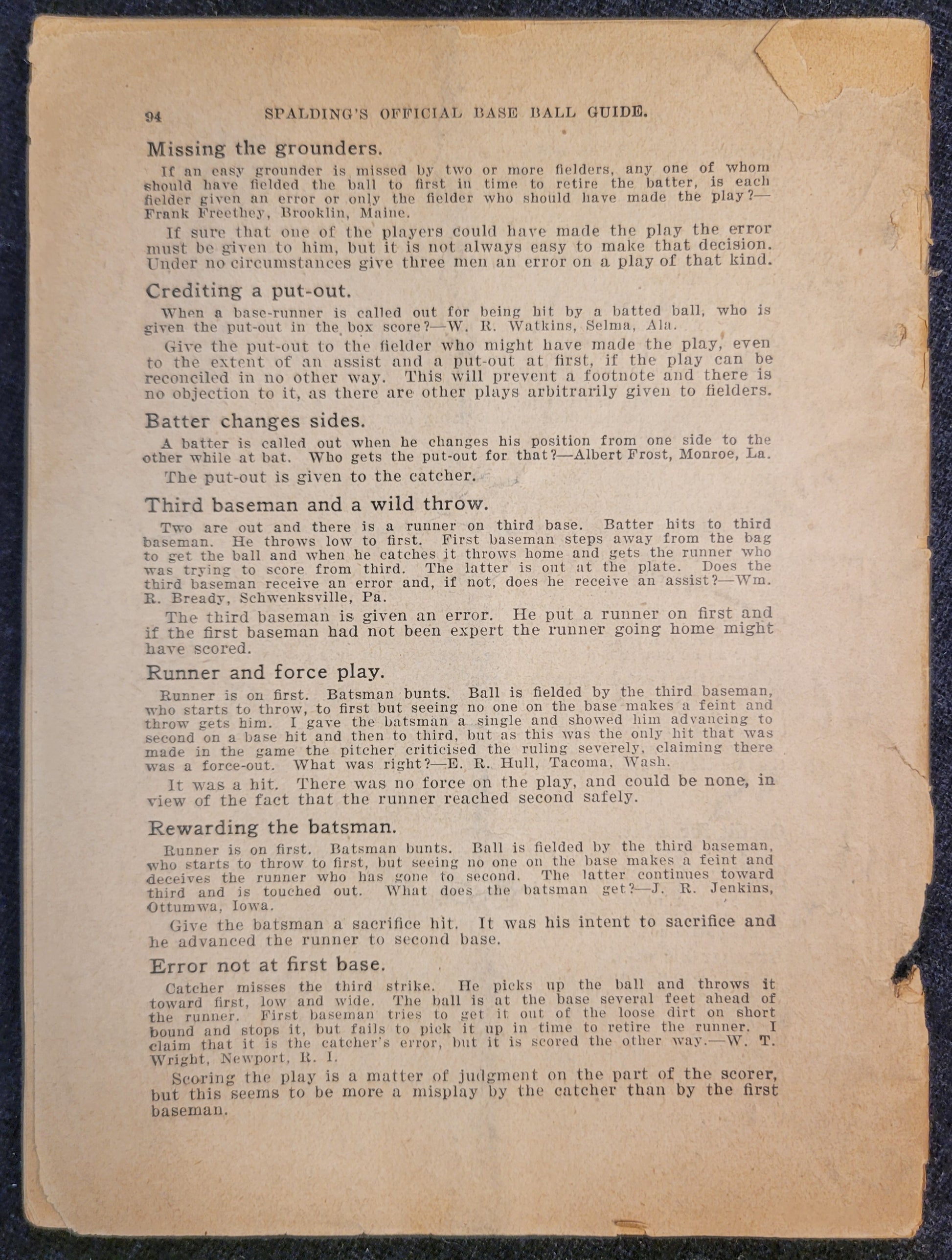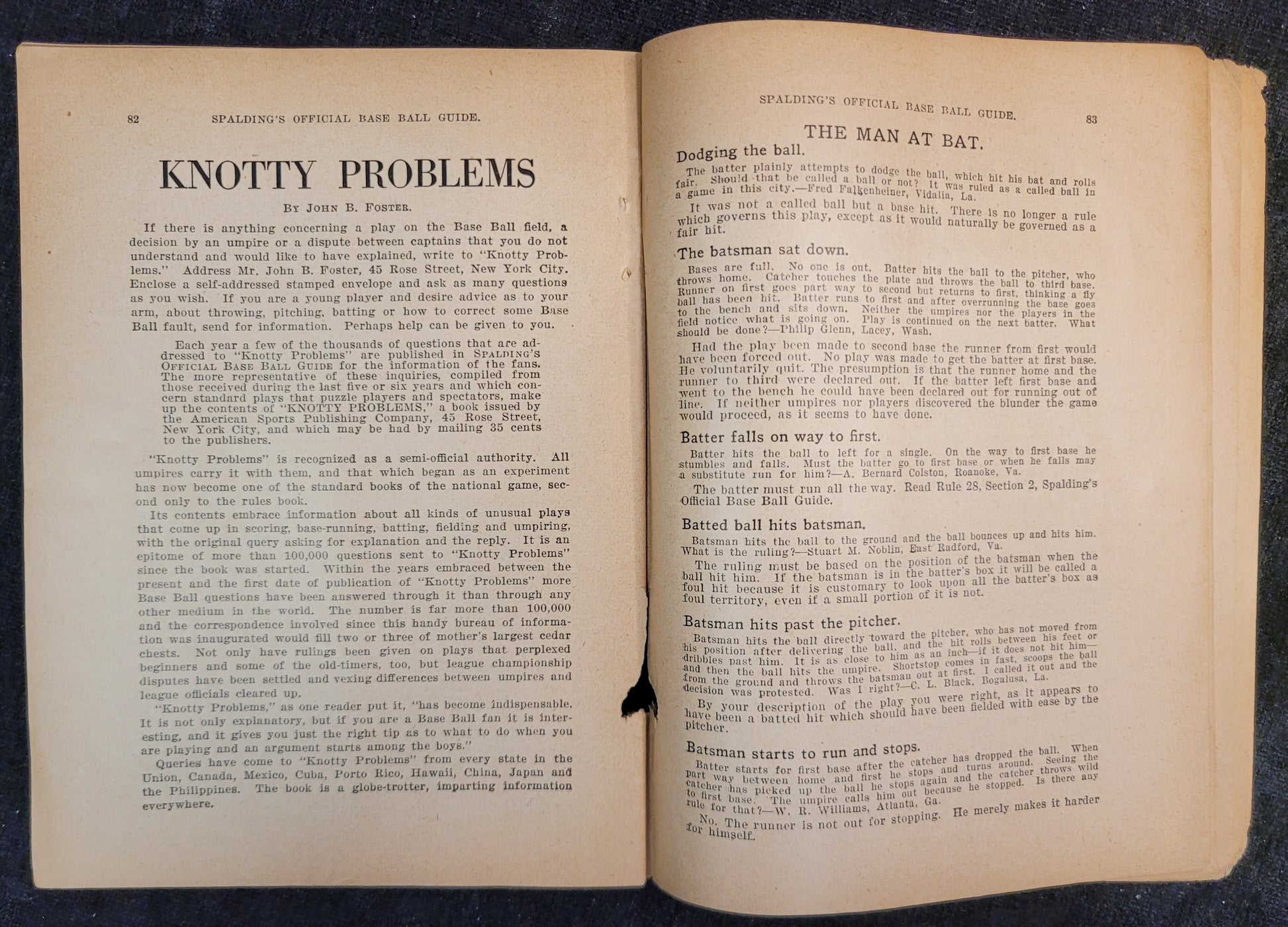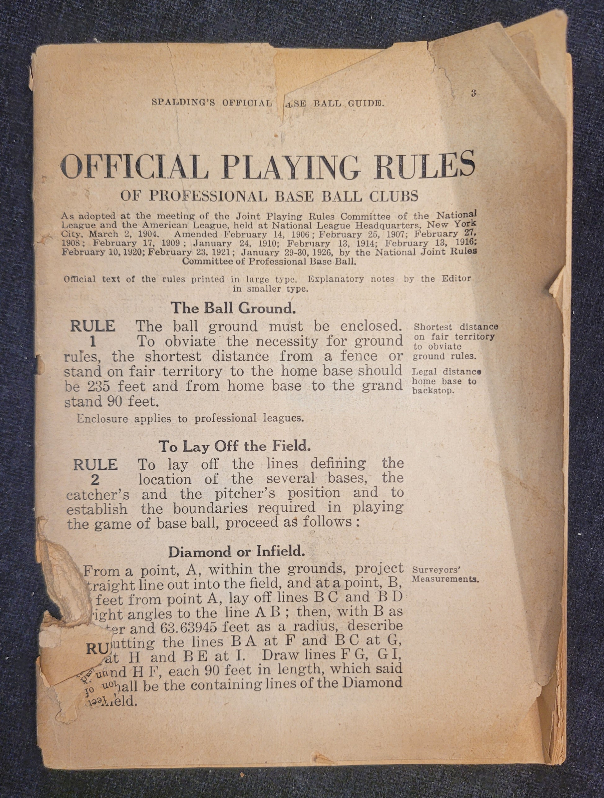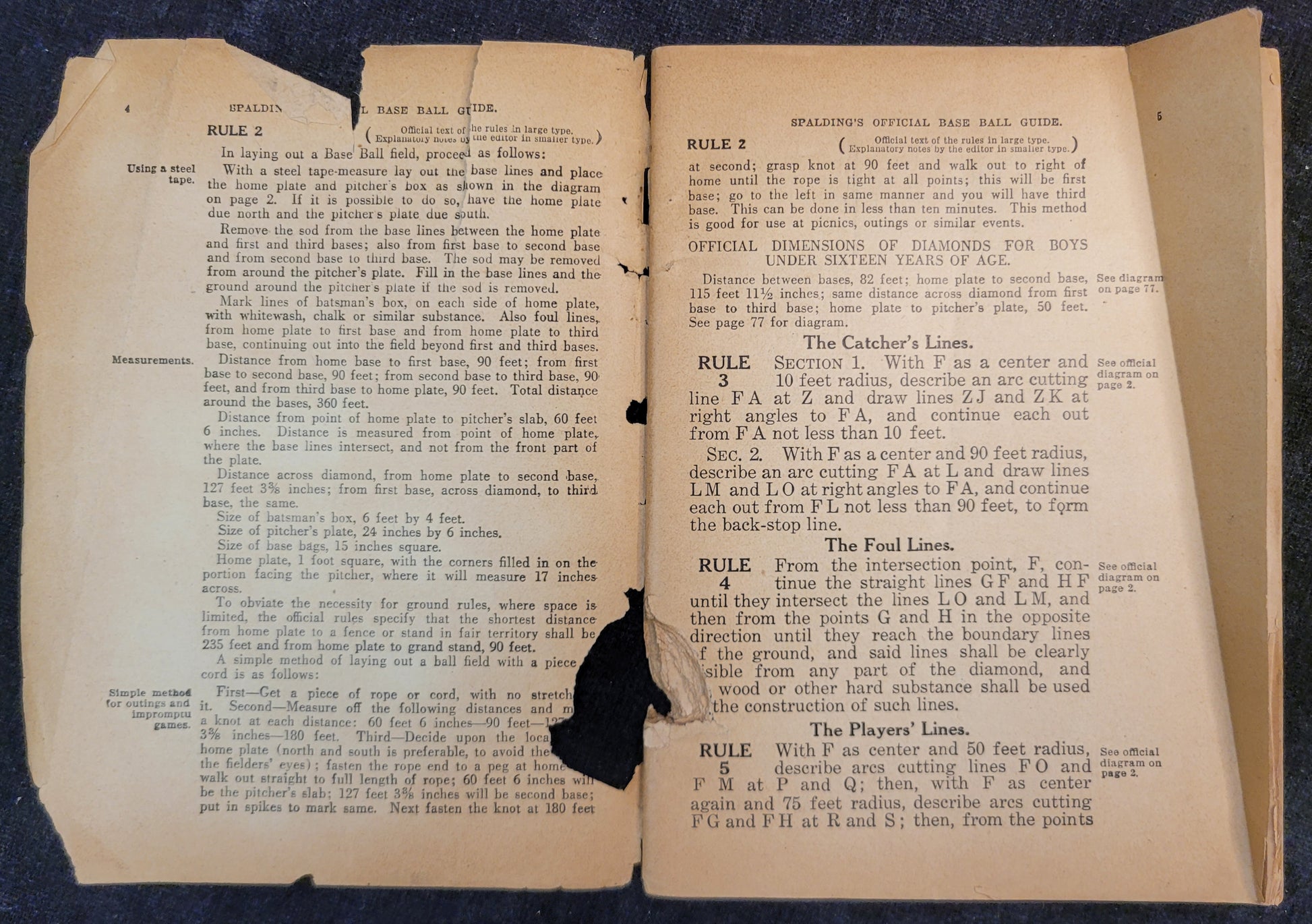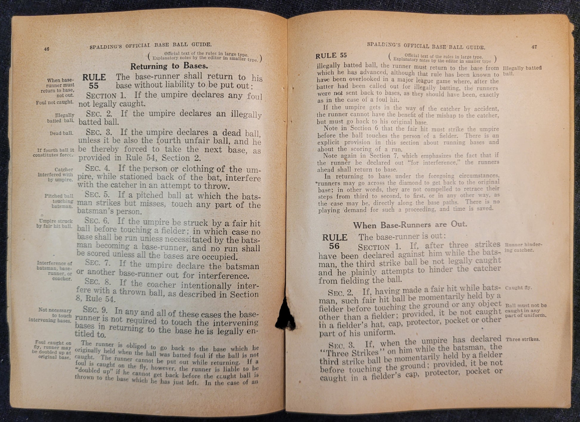 This baseball rule book is most likely from the 1920s based on signs of aging and production style. This copy is missing its cover as well as the first and last page. Rules one through 86, the index, diagrams, hints and stories are all more or less intact. There are signs of mouse damage along the spine and the pages are very brittle.