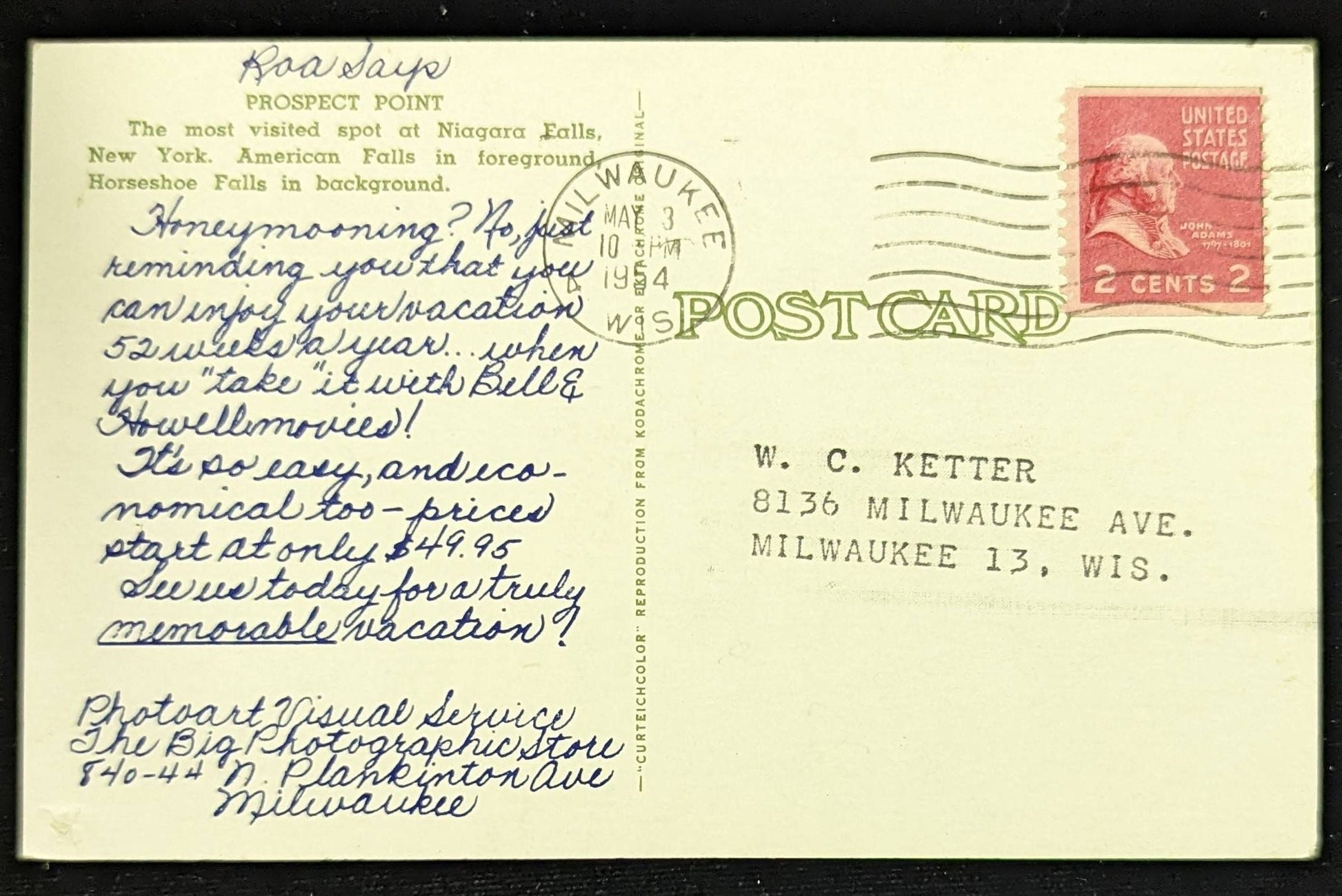 Prospect Point, Niagara Falls, New York - 1938 John Adams Red 2 Cent Stamp, Bell & Howell Advert - Vintage Postcard