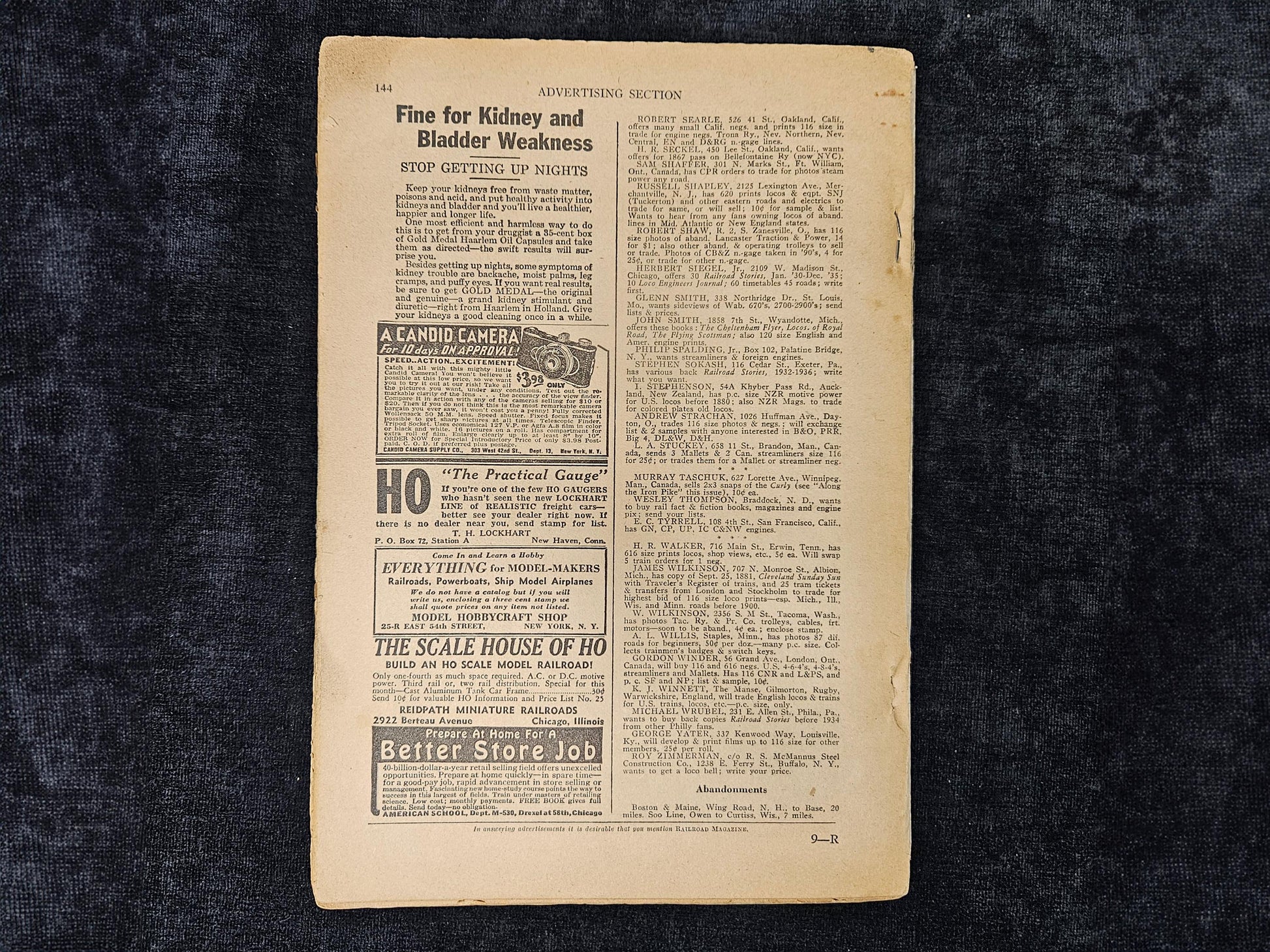The 1938 Railroad Magazine features true tales, illustrated features, and fiction about railroads. Featuring advertising sections inside and on the back cover.