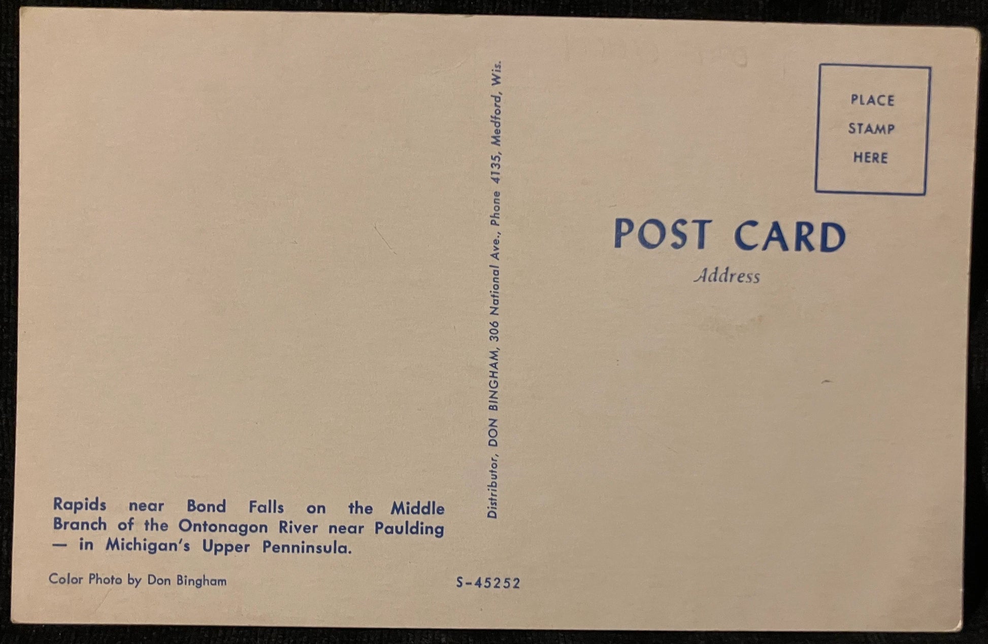 On back: Rapids near Bond Falls on the Middle Branch of the Ontonagon River near Paulding - in Michigan's Upper Peninsula.