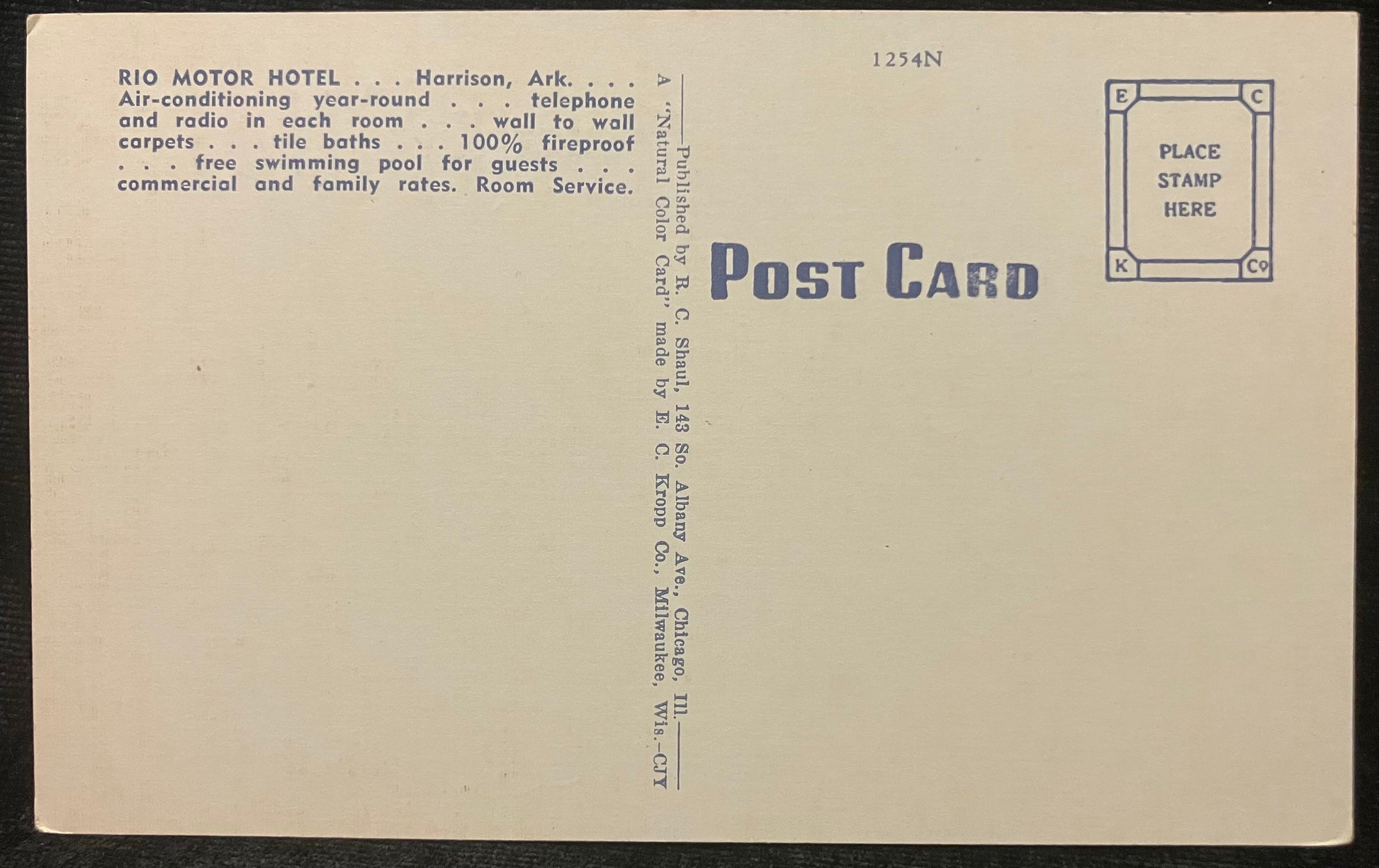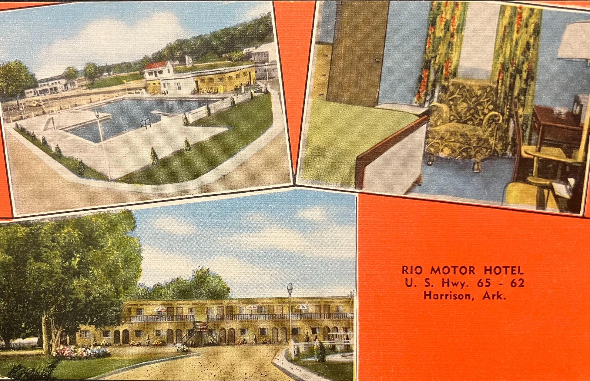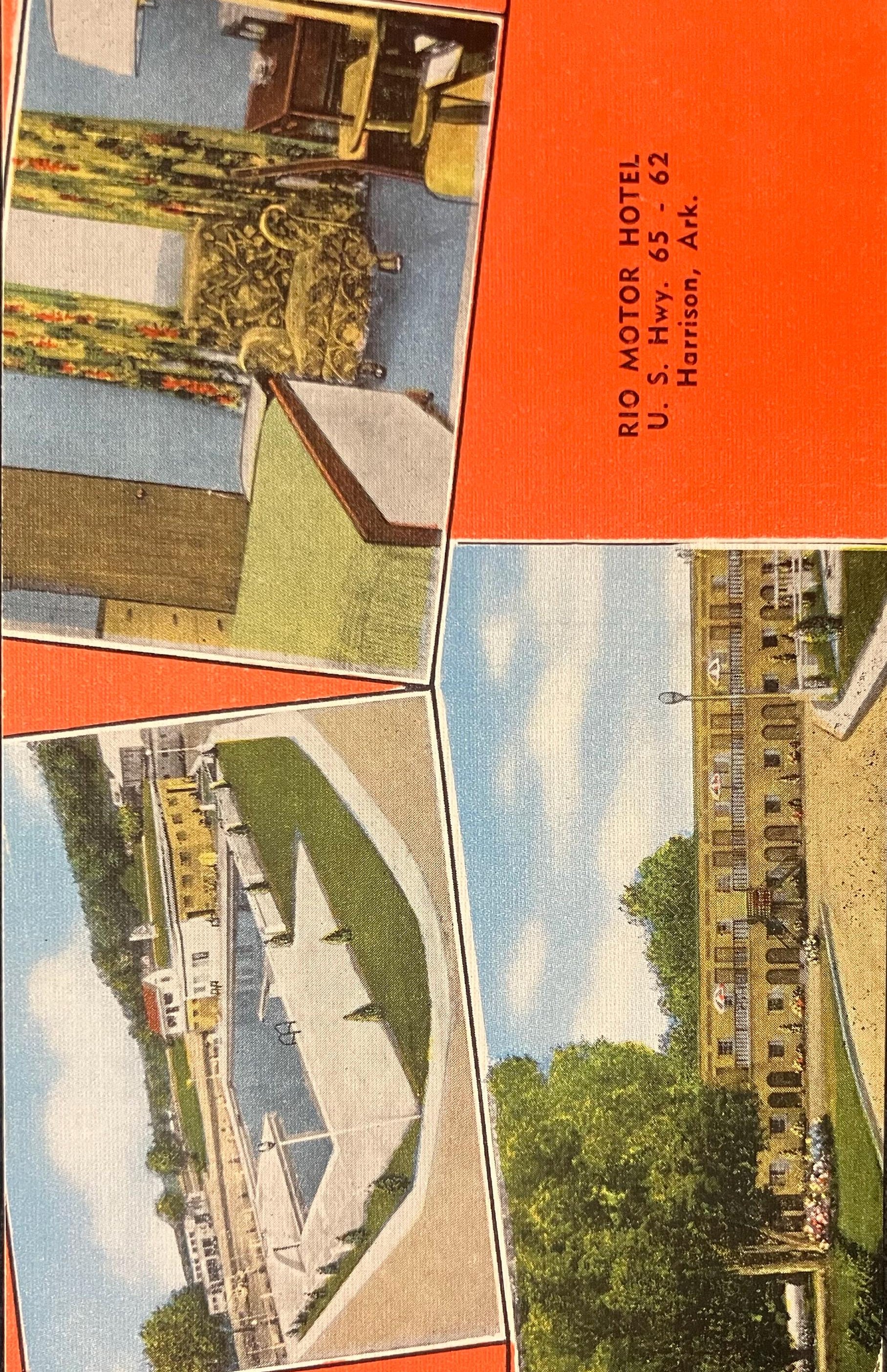 On back: Rio Motor Hotel… Harrison Ark… Air-conditioning year-round… telephone and radio in watch room…. wall to wall carpets… tile baths… 100% fireproof carpets… tile baths… 100% fireproof free swimming pool for guests… commercial and family rates. Room service.