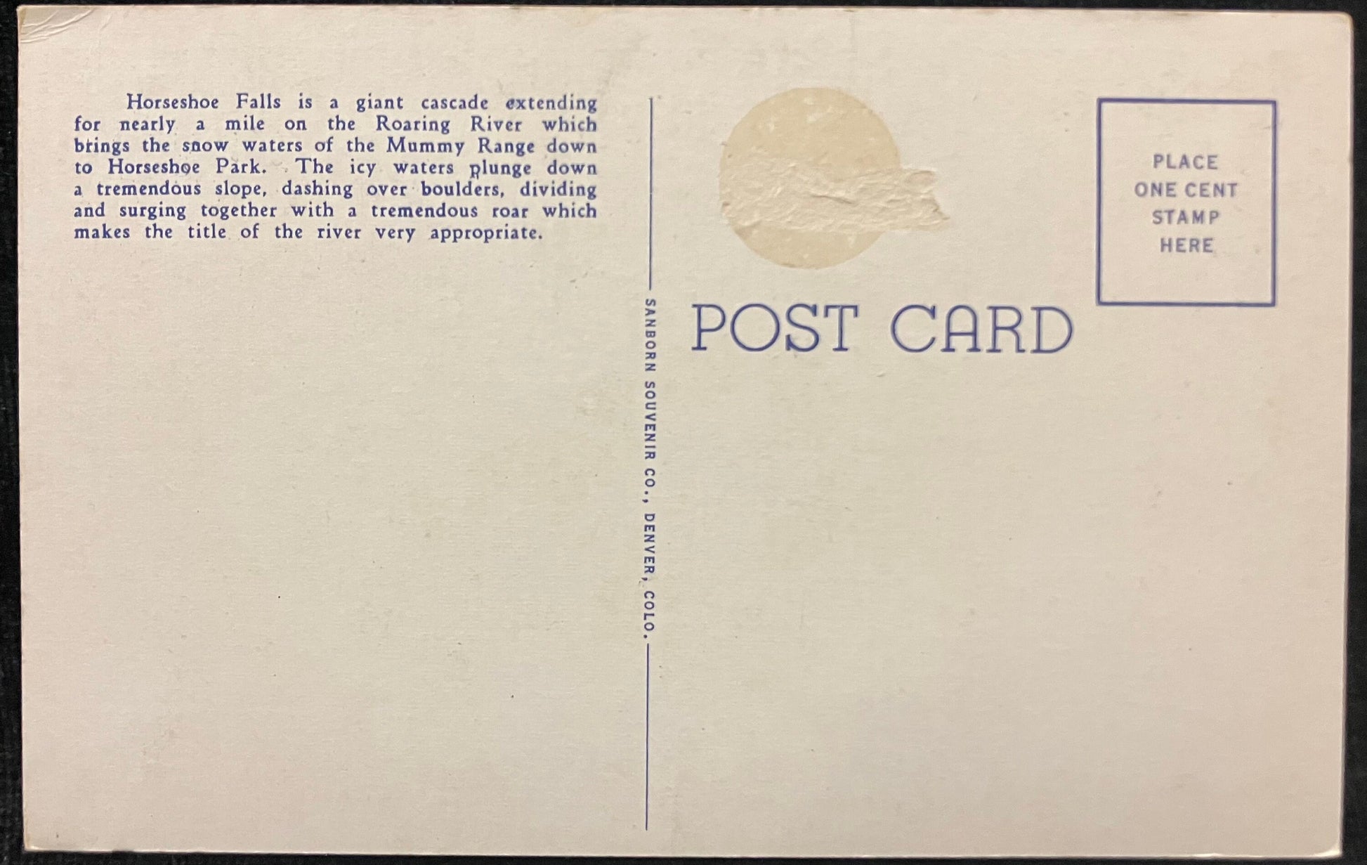 On back: Horseshoe Falls is a giant cascade extending for nearly a mile on the Roaring River, which brings the snow waters of the Mummy Range down to Horseshoe Park. The icy waters plunge down a tremendous slope, dashing over boulders, dividing and surging together with a tremendous roar which makes the title of the river very appropriate.