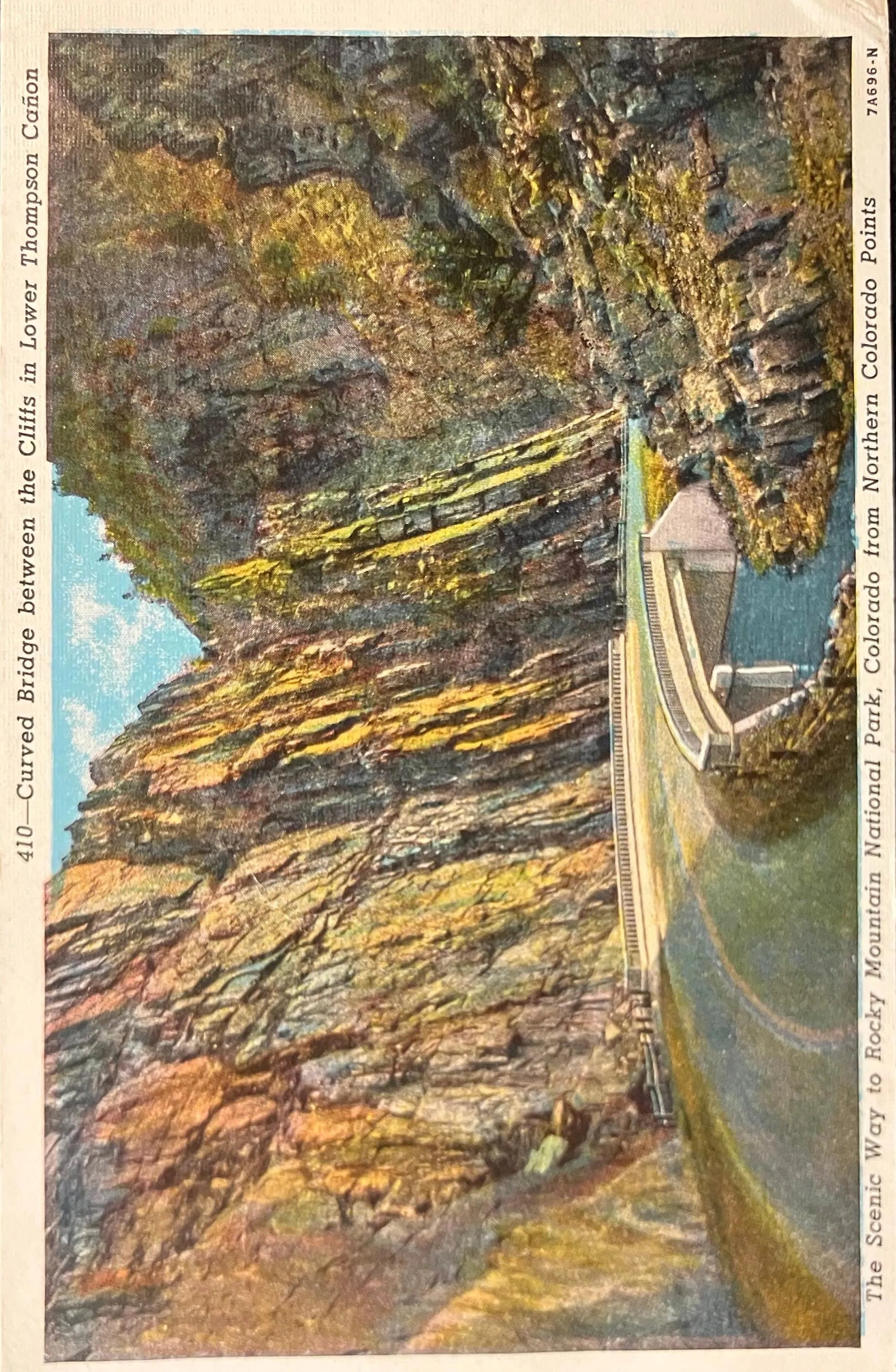 On front: The Scenic Way to Rocky Mountain National Park, Colorado from Northern Colorado Points Curved Bridge between the Cliffs in Lower Thomspon Cañon