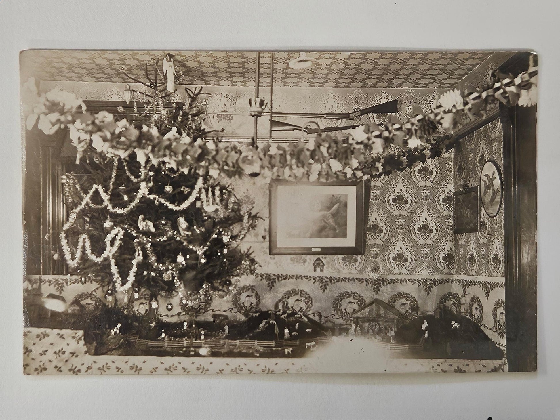 This Christmas RPPC is full of details and all point to the fact the scene belonged to a hunter. The pictures on the wall have hunting dogs and Ducks, there are two large shot guns proudly mounted in this main room of the home. The tree appears to be on the top of the dining table with a large paper guard with Santa in wreathes surrounding the expansive fenced in Nativity Scene on the table. The tree decorations include popcorn and tinsel garlands, hand blown German ornaments and an Angel topper. The room it is all located in has wallpaper on the walls and the ceiling plus a suspended gas light fixture. What a rare funfilled RPPC photo!