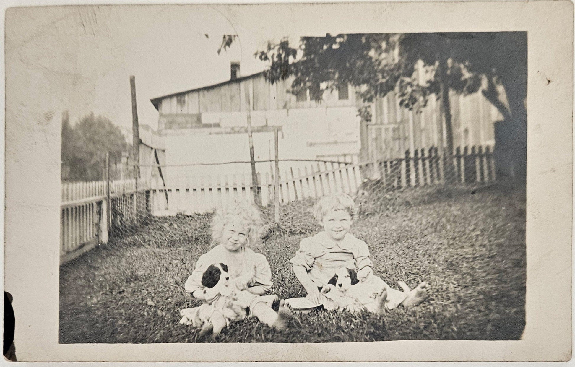 RPPC - 1911 Ohio - Two Young Sisters Playing With New Puppies In the Yard - Farm Life 1911 - Very Early Christmas Photo Card