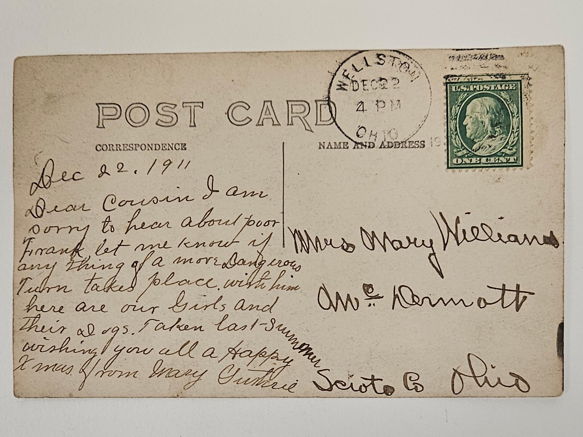 The card is in good condition and was mailed as a Christmas Photo Card - Rather a rarity in 1911. Caring personal note on the back side of the card. with a green one cent Franklin Stamp.