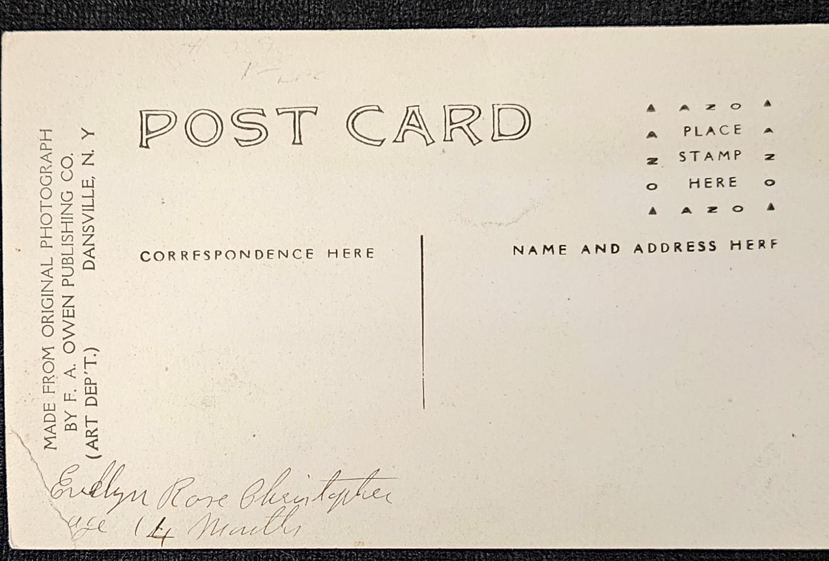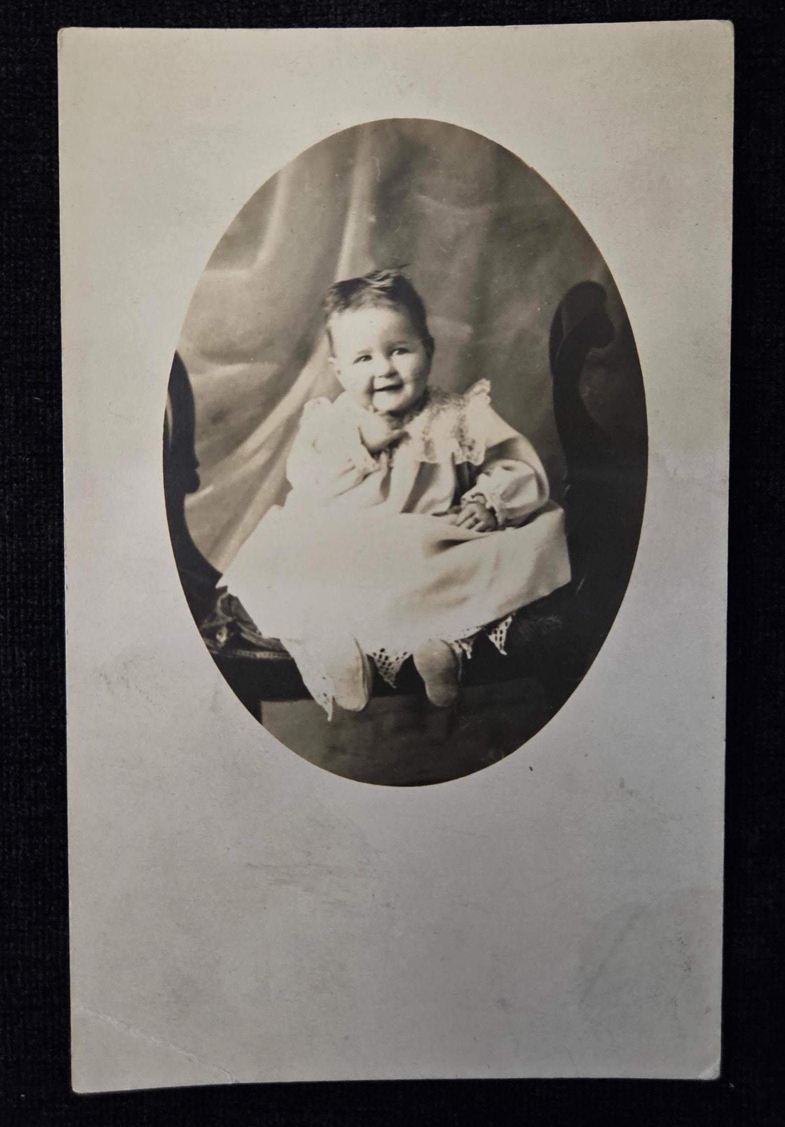 RPPC - Cute Smiling Baby Evelyn - Oval Shaped Portrait Photo - 14 month Old Toddler on Bench 1910 - Owen Publishing Danville New York