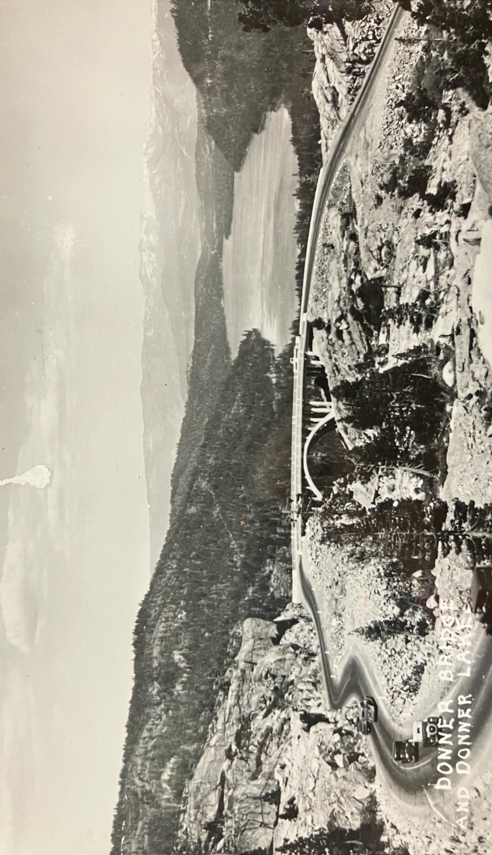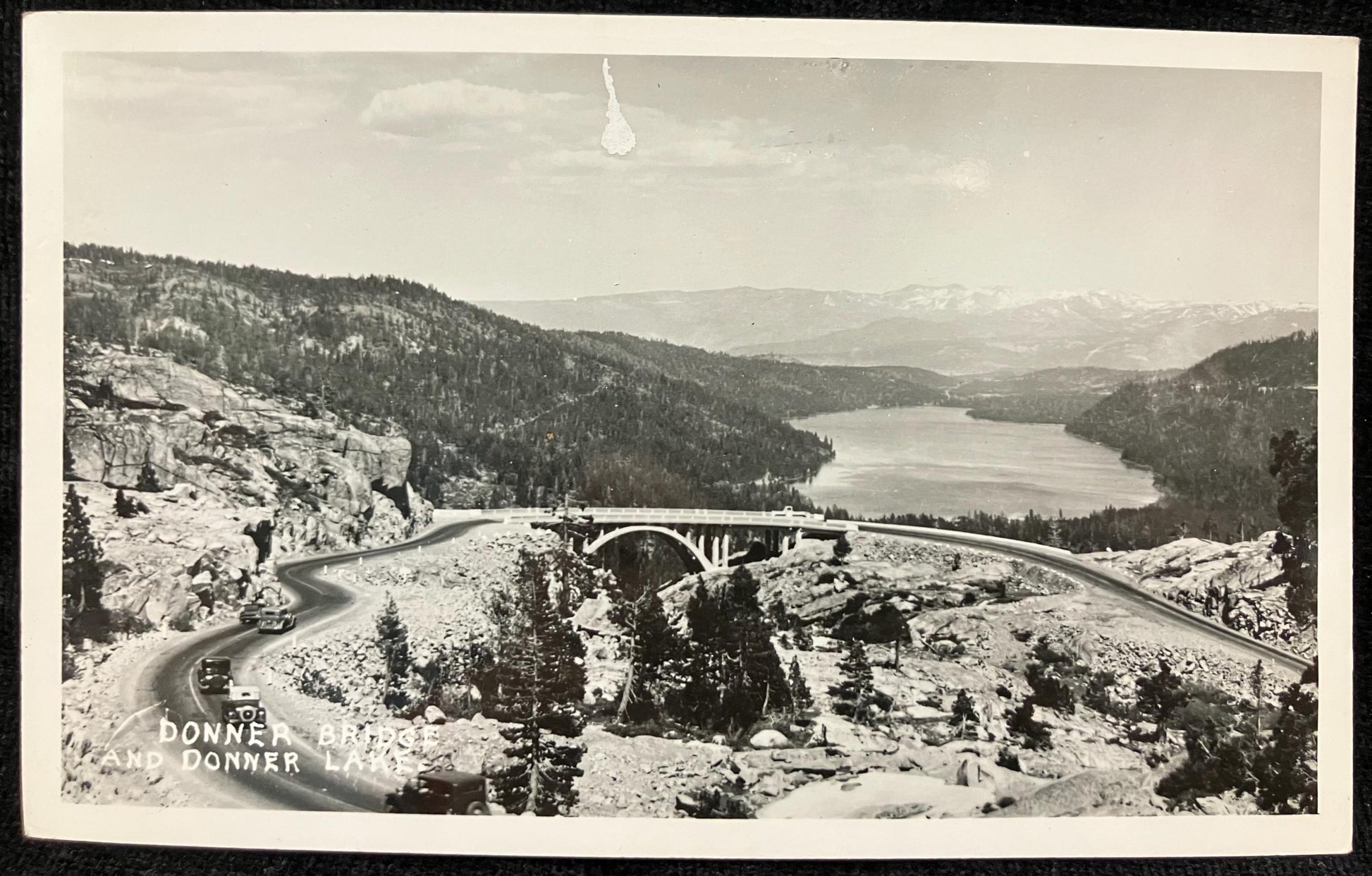 Donner Bridge and Donner Lake with cars. A beautiful view while traveling! This is at 5,955 feet elevation, and the Lake is 1.3 square miles with a depth of 328 feet deep in some areas. The 1920s Cars in the photo are moving through the curves. Wonderful black and white photo. never mailed. The small white area in the sky appears to be from a small flick of moisture.