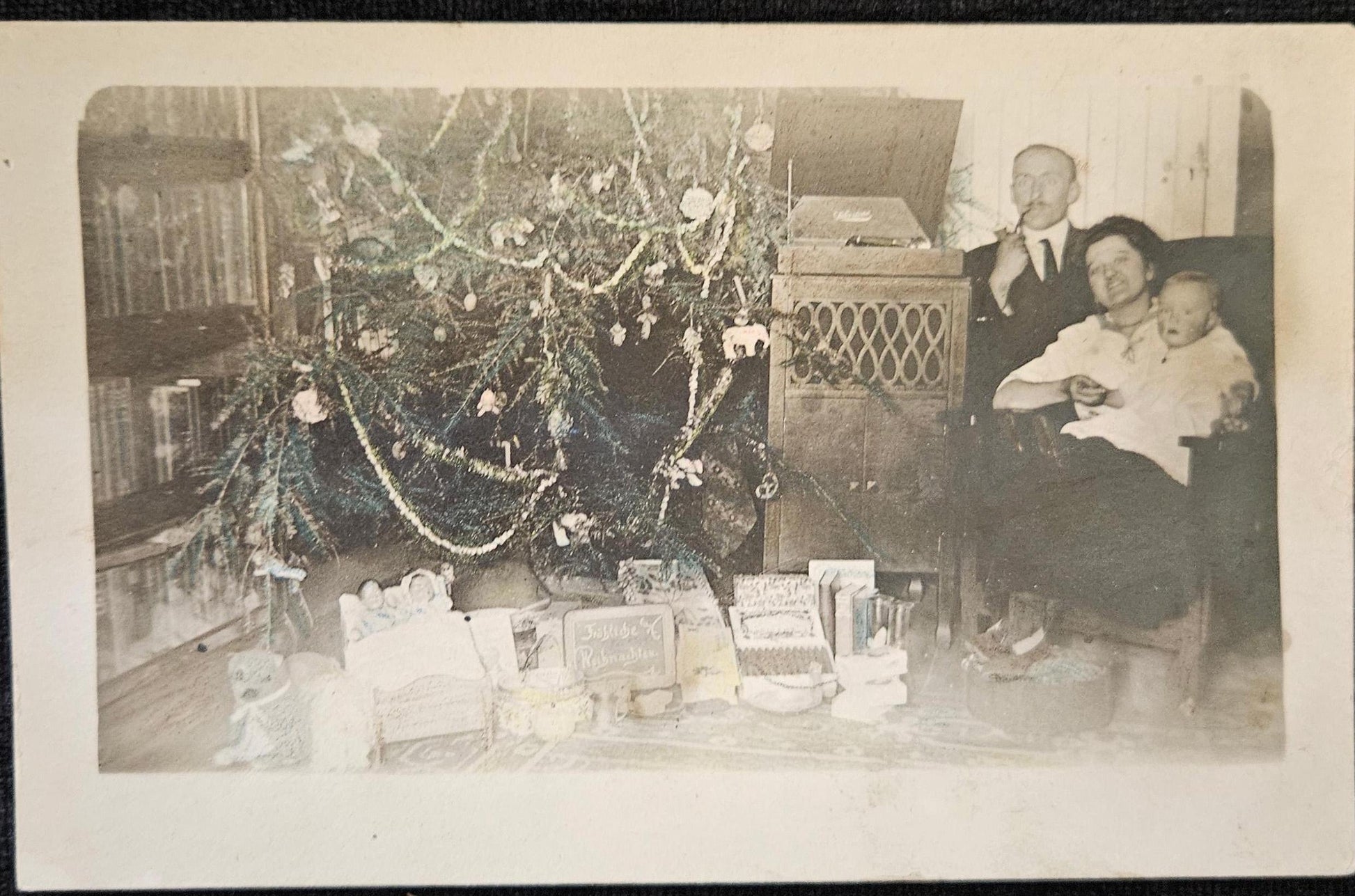 RPPC - Family by Christmas Tree - 1930 Phonograph in Background - Gifts Under Tree for Mother, Father, and Baby - Blown Glass Ornaments on Tree