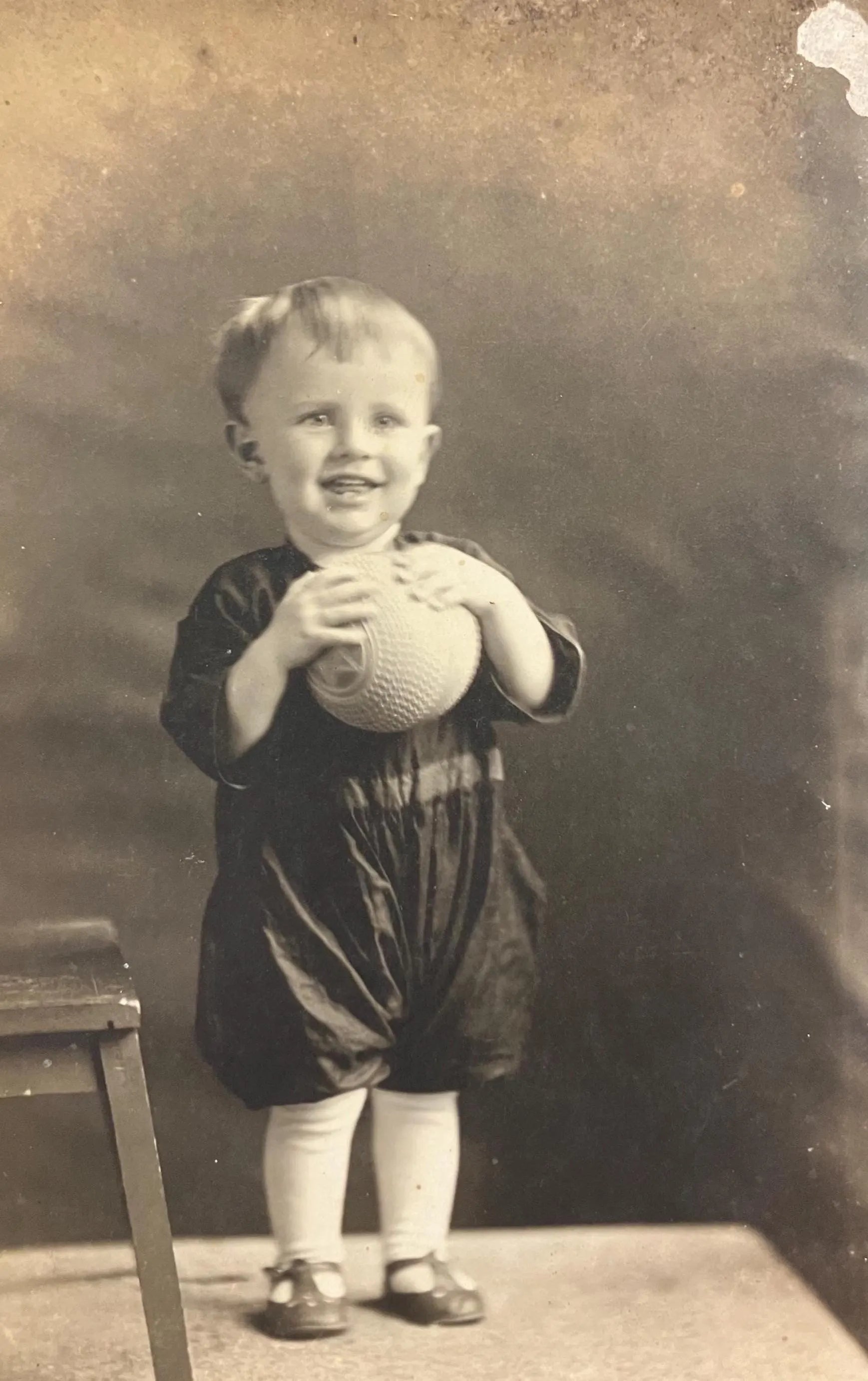 RPPC - Smiling Toddler Boy with a ball in 1910 - Vintage Real Photo Postcard - little boy with tiny feet