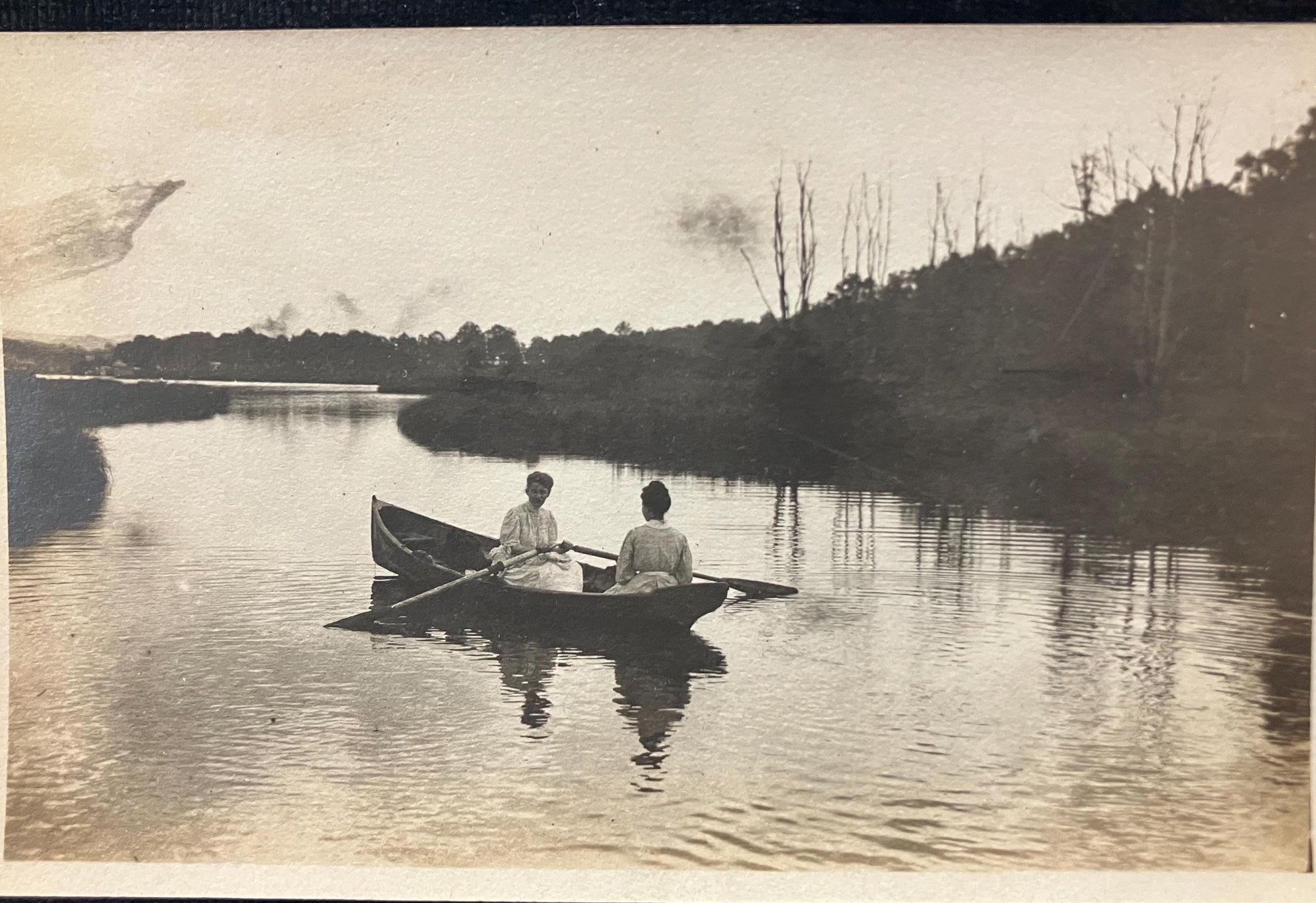 Two Women Rowing on a River in Southern Michigan- Real Photo Postcard of Boating - Maybe Kalamazoo River - Cooling off in Summer 1900