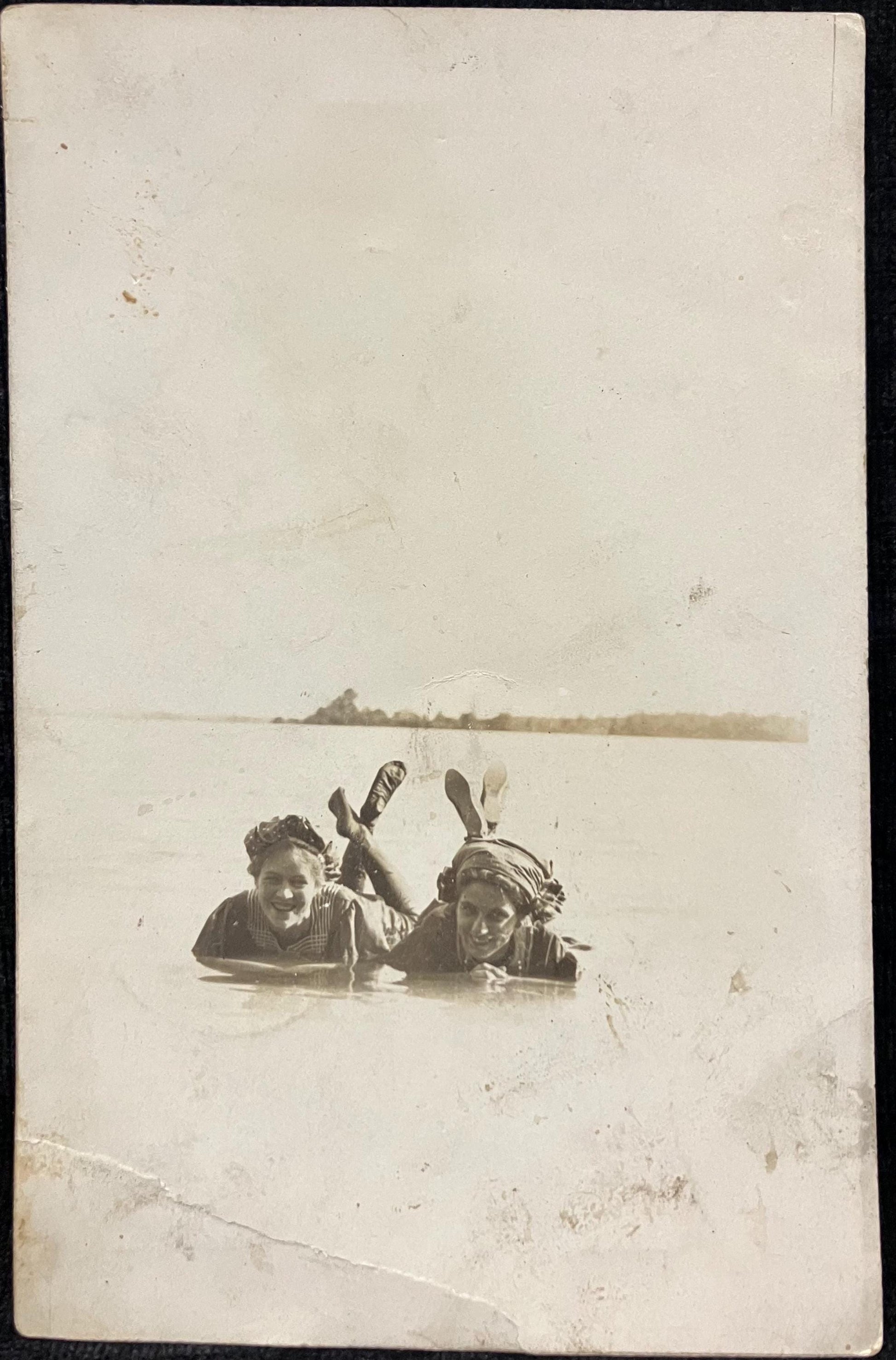 Two Young Women Enjoying a Lake - Feet up out of the Water - 1910 Michigan Bathing Wear Complete with bathing caps Lake life postcard