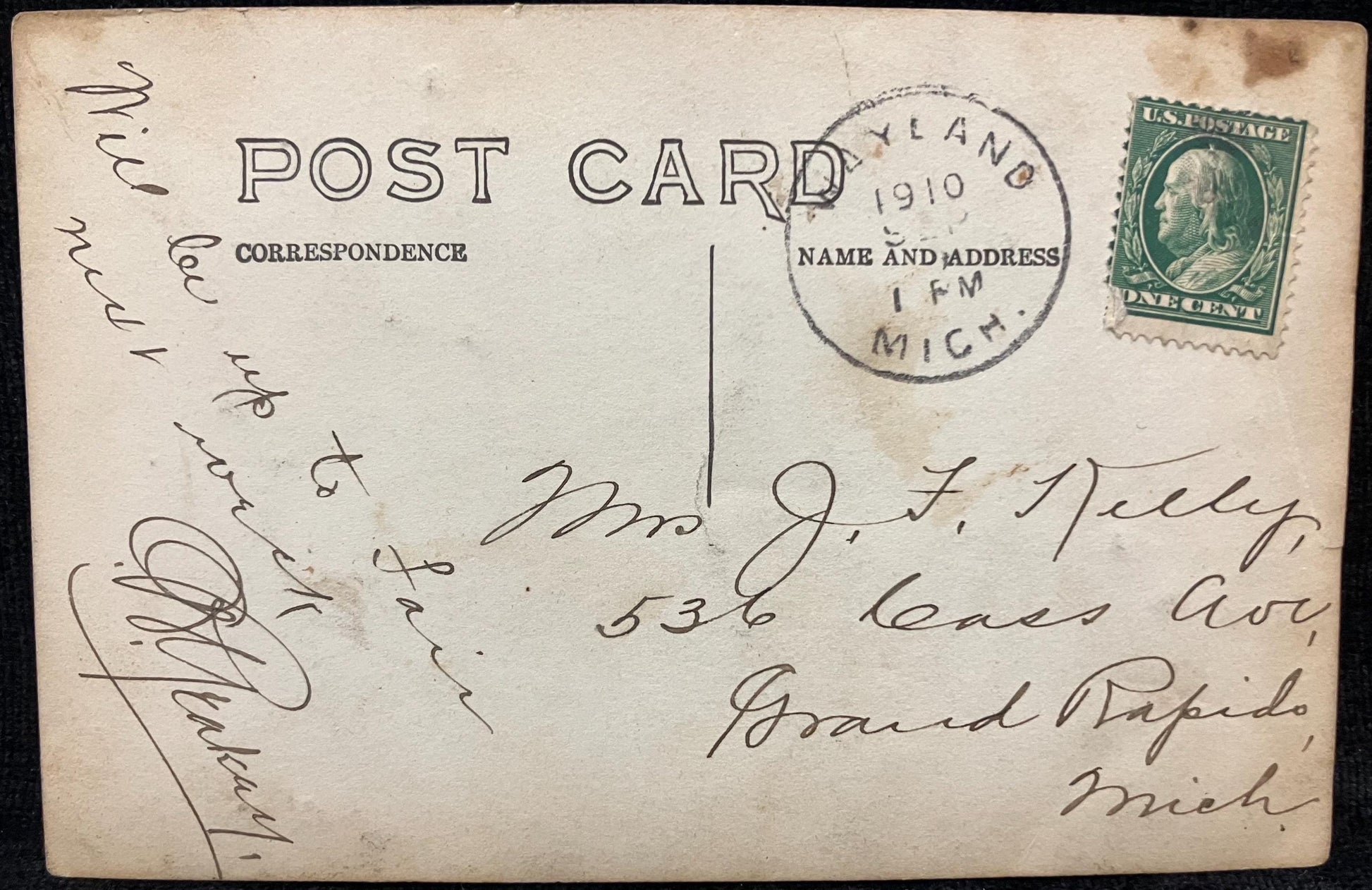 Mailed: Postmark 1910 Green one cent Benjamin Franklin stamp. From Grayling, Michigan to Grand Rapids