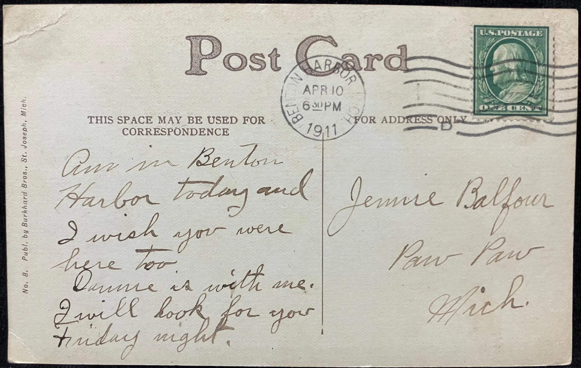 Mailed: Postmark 1911 green one cent Benjamin Franklin stamp