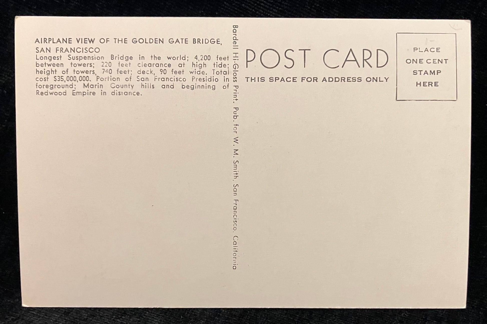 On back: Airplane View of the Golden Gate Bridge, San Francisco. Longest Suspension Bridge in the world; 4,200 feet between towers; 220 feet clearance at high tide; height of towers, 740 feet; deck, 90 feet wide. Total cost $35,000,000. Portion of San Francisco Presidio in foreground; Marin County hills and beginning of Redwood Empire in distance.