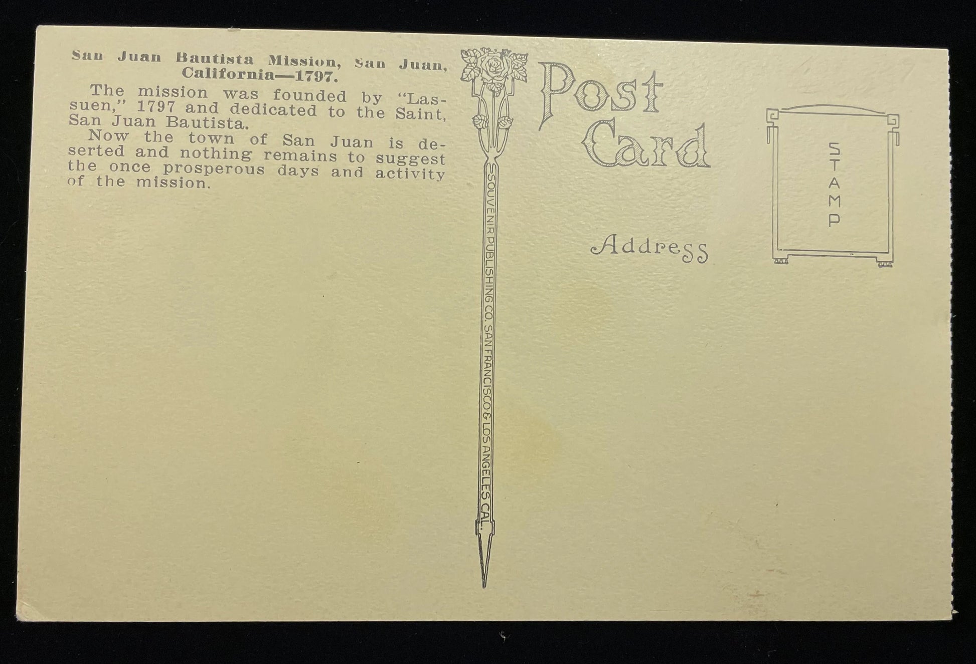Back: San Juan Bautista Mission, San Juan, California --- 1797 The mission was founded by "Lassuen," 1797 and dedicated to the Saint, San Juan Bautista. Now the town of San Juan is deserted and nothing remains to suggest the once prosperous days and activity of the mission."