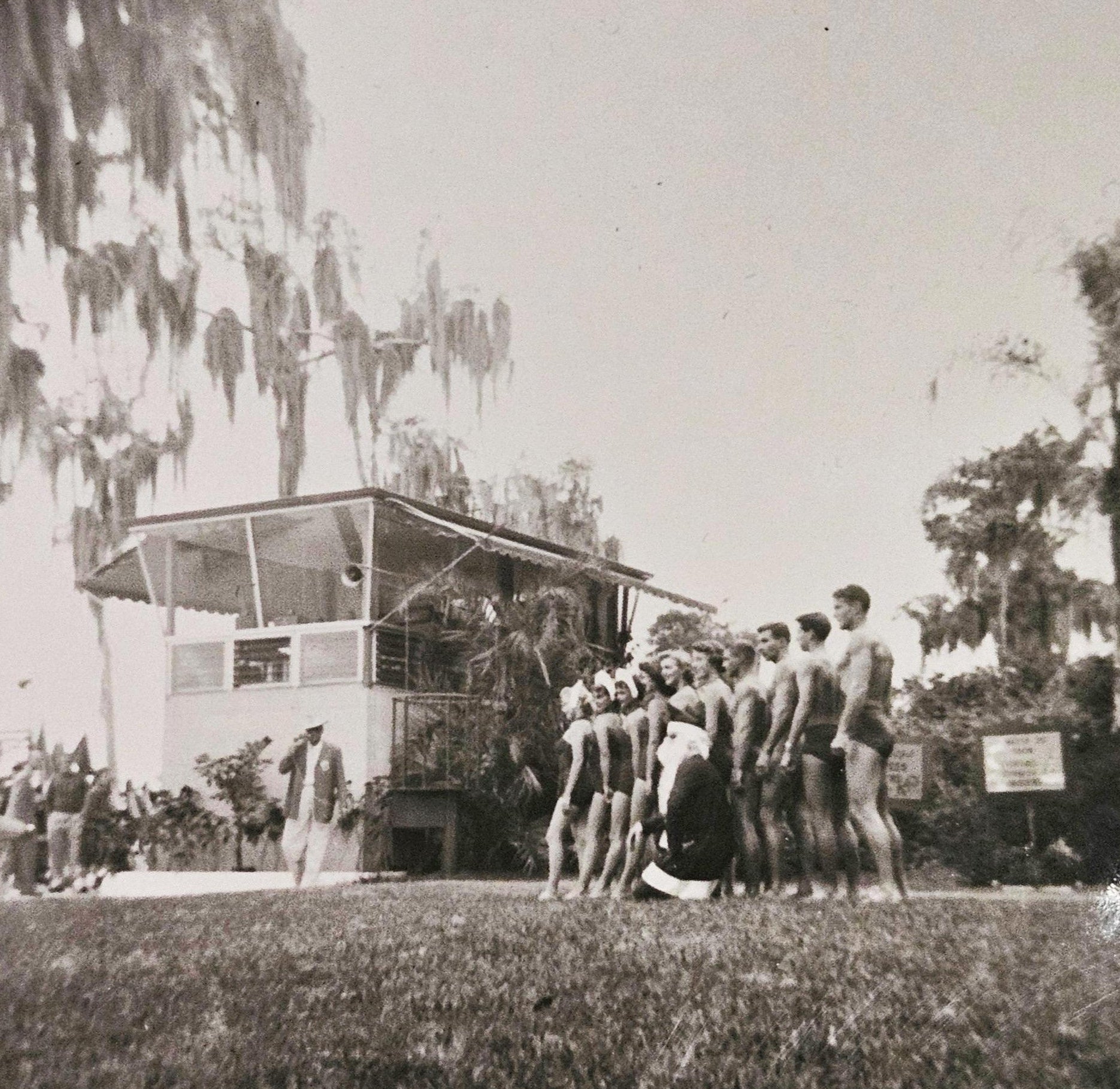 Swimmers Lined up by Height all in same bathing suits, probably synchronized swim team ready for a Holiday Show