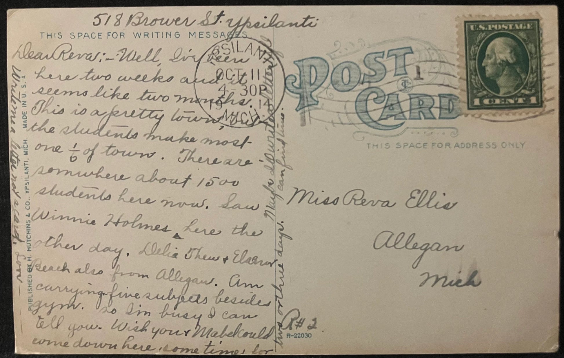 Mailed: Postmark on Oct 11, 1914 from Ypsilanti, Mich. with a green one cent George Washington stamp