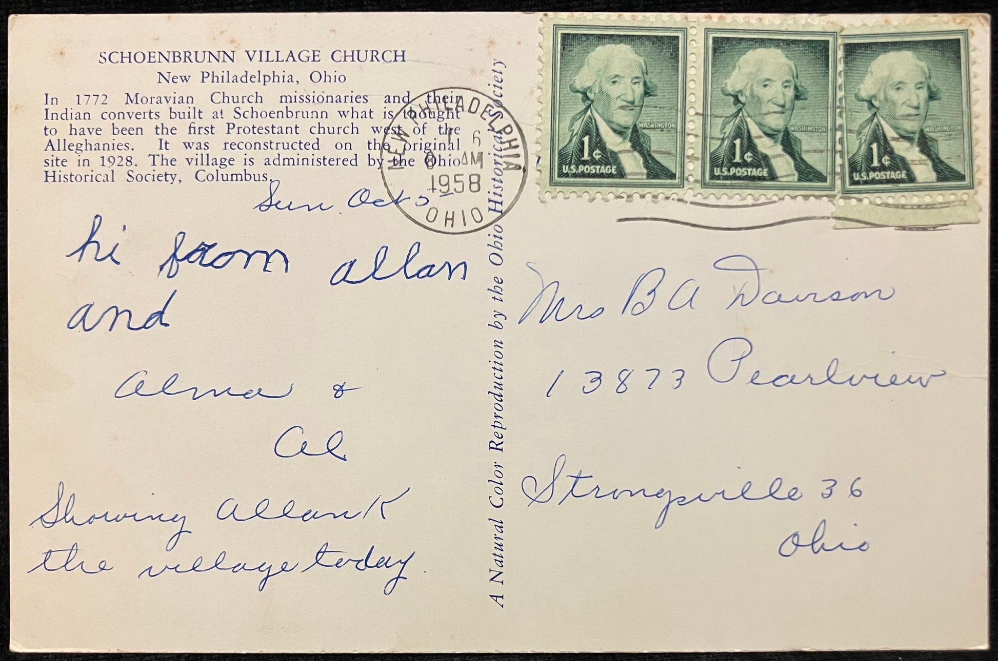 On front: A photo of Schoenbrunn Village Church in New Philadelphia, Ohio