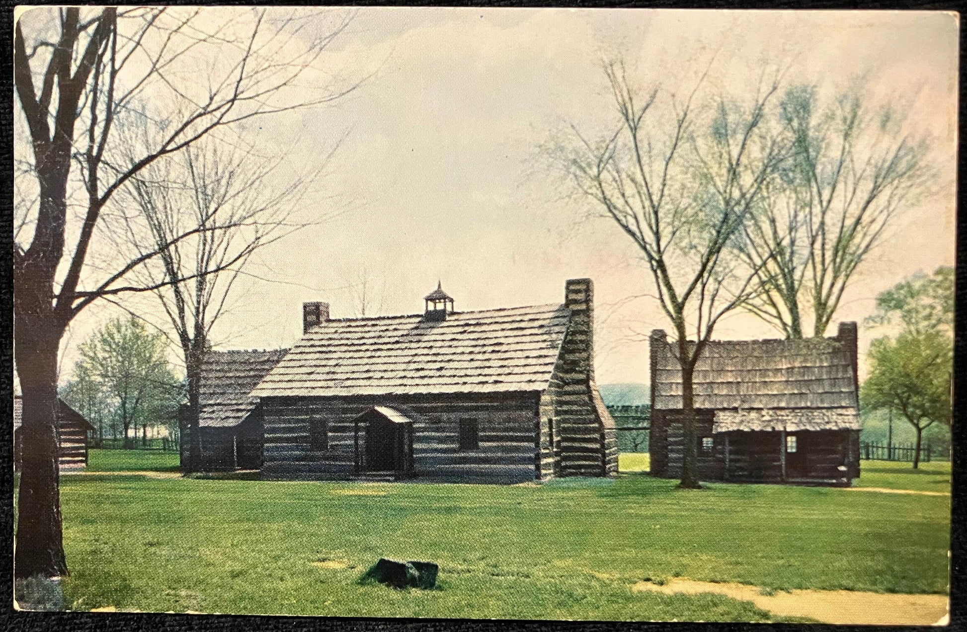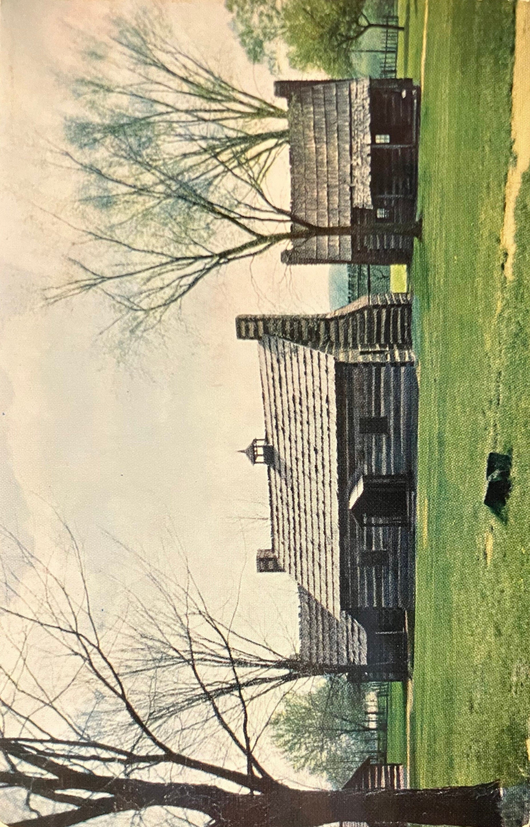 On back: Schoenbrunn Village Church New Philadelphia, Ohio. In 1772 Moravian Church missionaries and their Indian converts built at Schoenbrunn what is thought to have been the first Protestant church west of the Alleghenies. It was reconstructed on the original site in 1928. The village is administered by the Ohio Historical Society, Columbus.