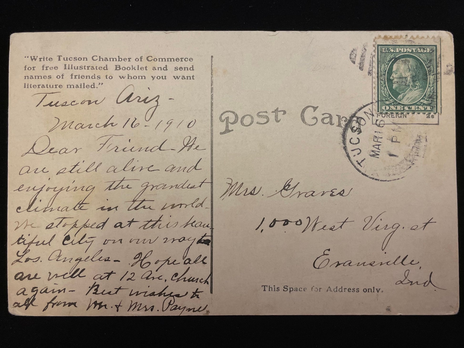 On the back, "Write Tucson Chamber of Commerce for free Illustrated Booklet and send names of friends whom you want literature mailed."