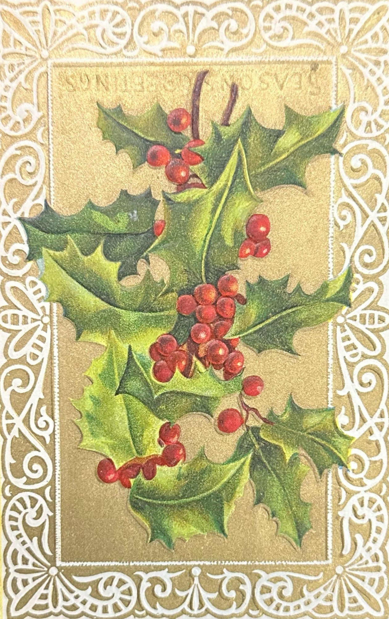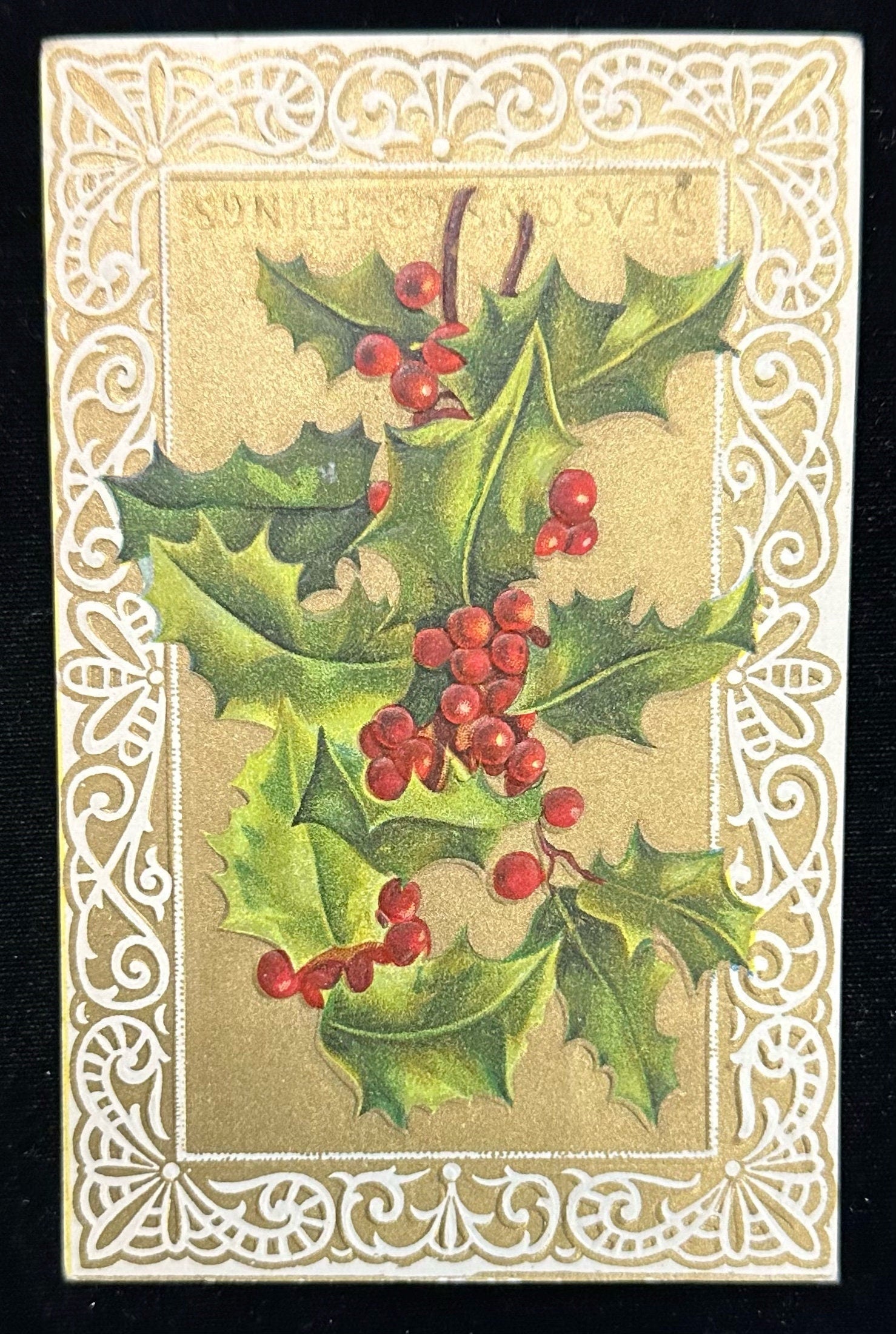 Seasons Greetings - Gold Embossed Christmas Card with Holly - 1920s Vintage Postcard