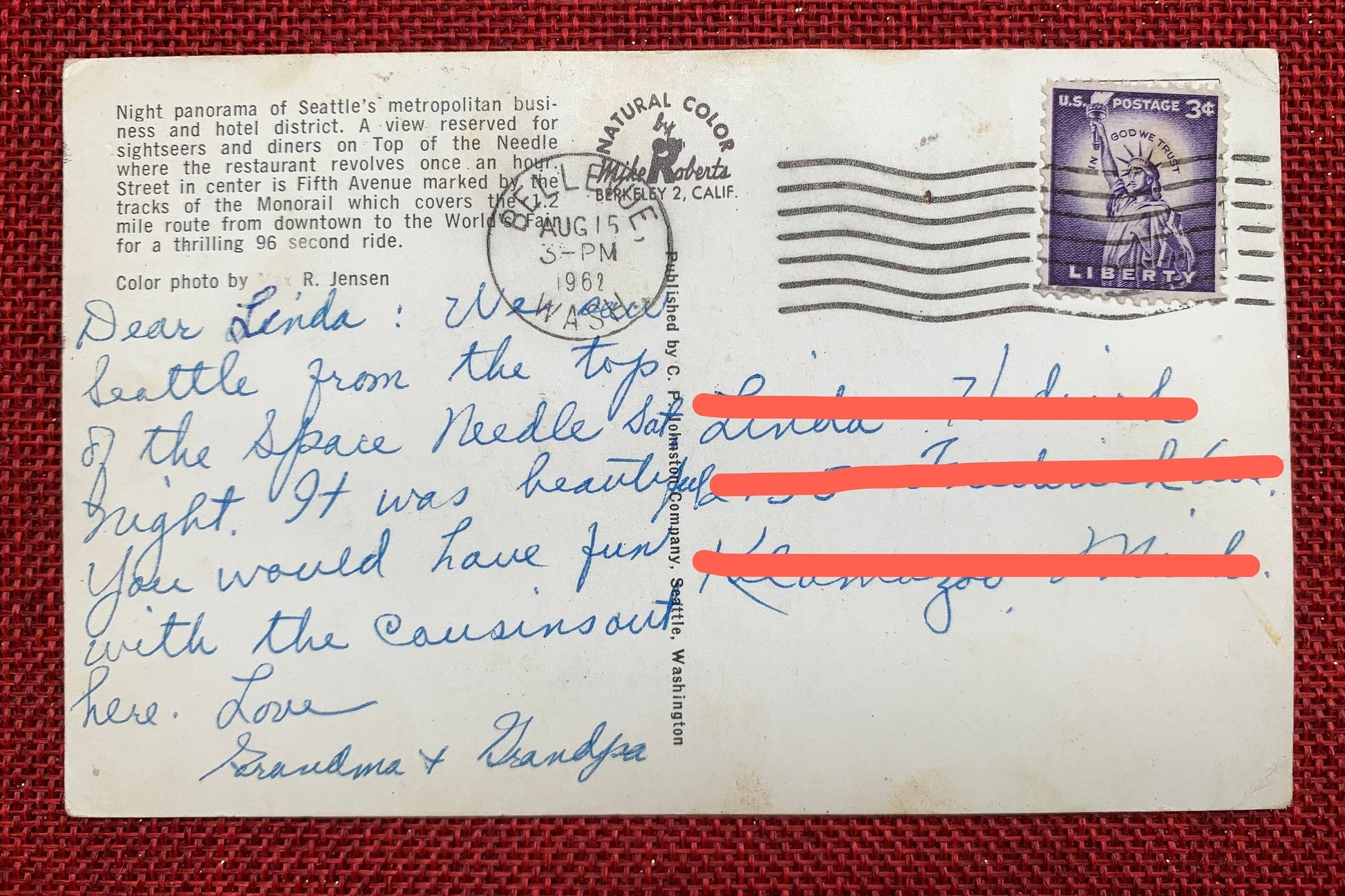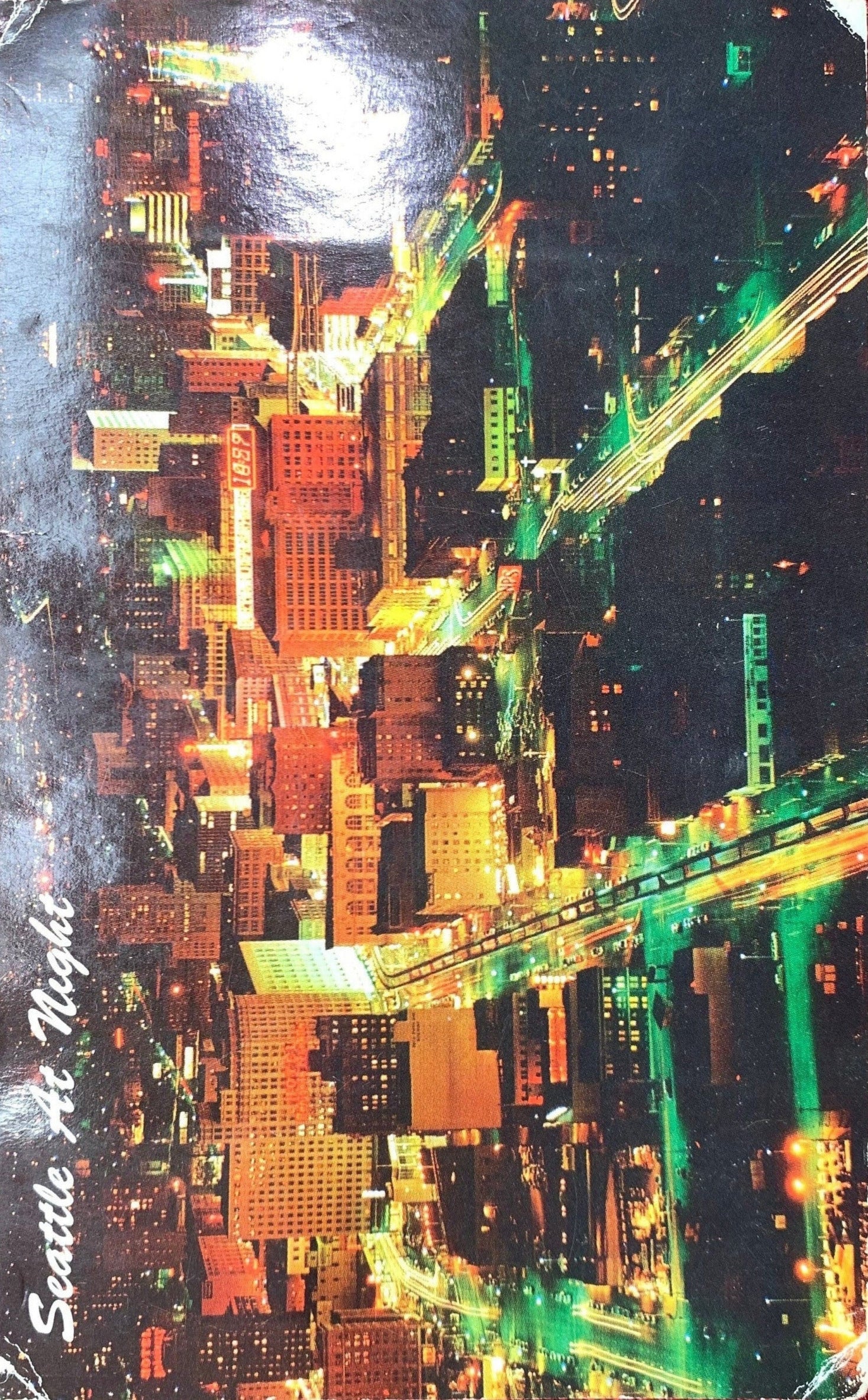 This postcard features an aerial photograph of Seattle, Washington taken at night.