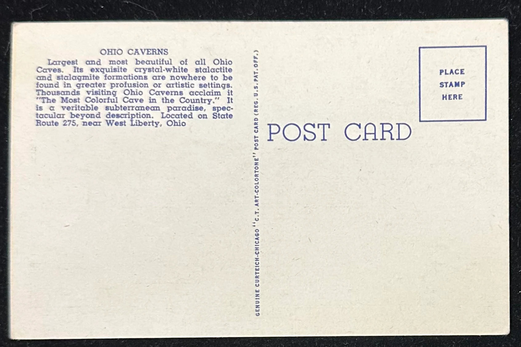 Back Information: Ohio Caverns - Largest and most beautiful of all Ohio Caves. It’s exquisite crystal-white stalactite and stalagmite formations are nowhere to be found in greater profusion or artistic settings. Thousands visiting Ohio Caverns acclaim it “The Most Colorful Cave in the Country.” It is a veritable subterranean paradise, spectacular beyond description. Located on State Route 275, near West Library, Ohio.