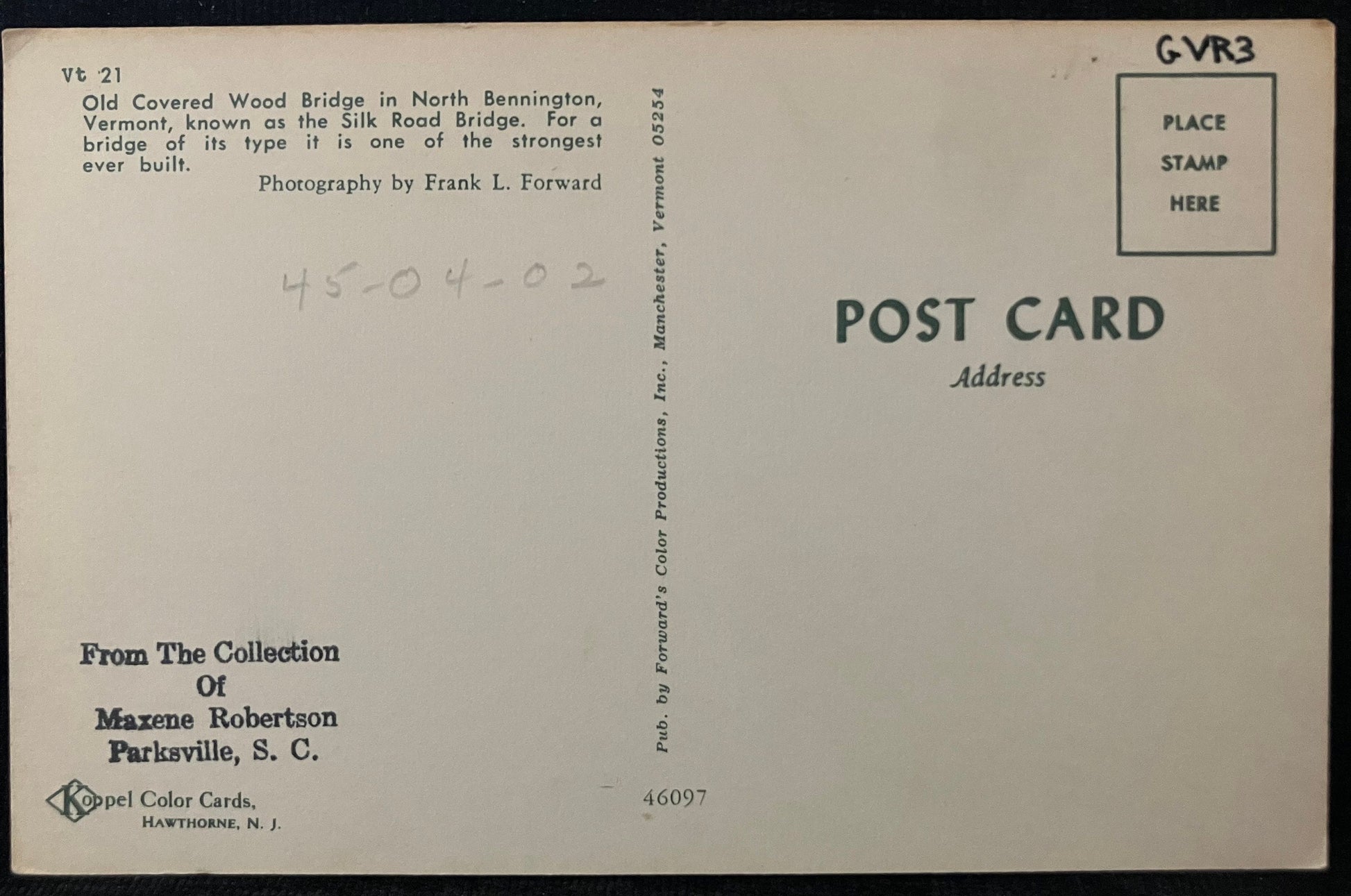 On back: Old Covered Wood Bridge in North Bennington, Vermont, known as the Silk Road Bridge. For a bridge of its type it is one of the strongest ever built.