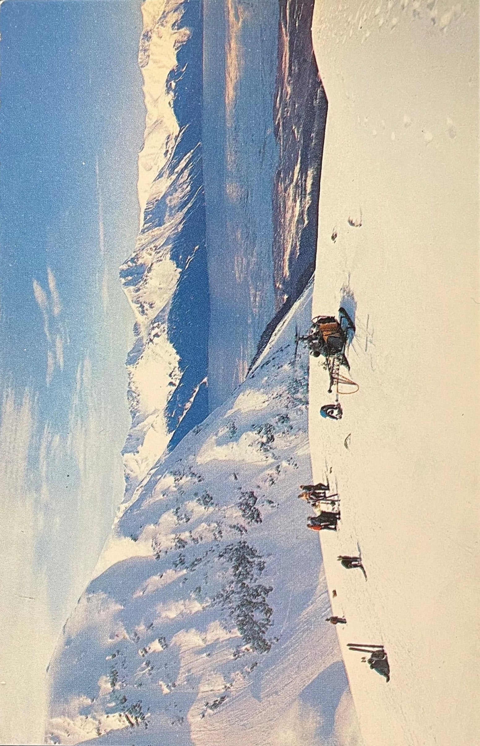 Back information- "At this stage of development in this pioneer land, there is lots of snow and skiers but no lodges or ski lifts-- so helicopters here are used to provide transport to these peaks near Anchorage."