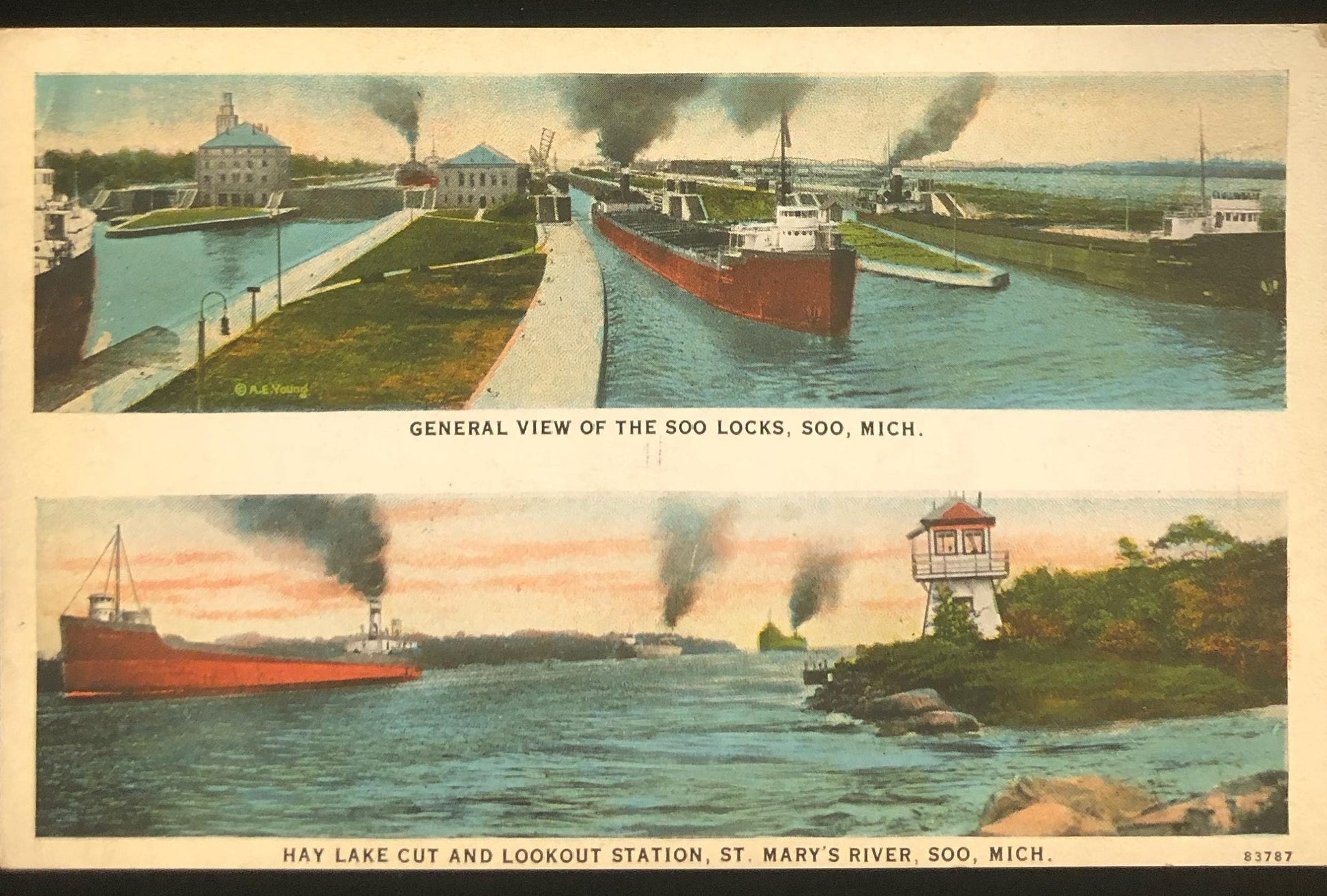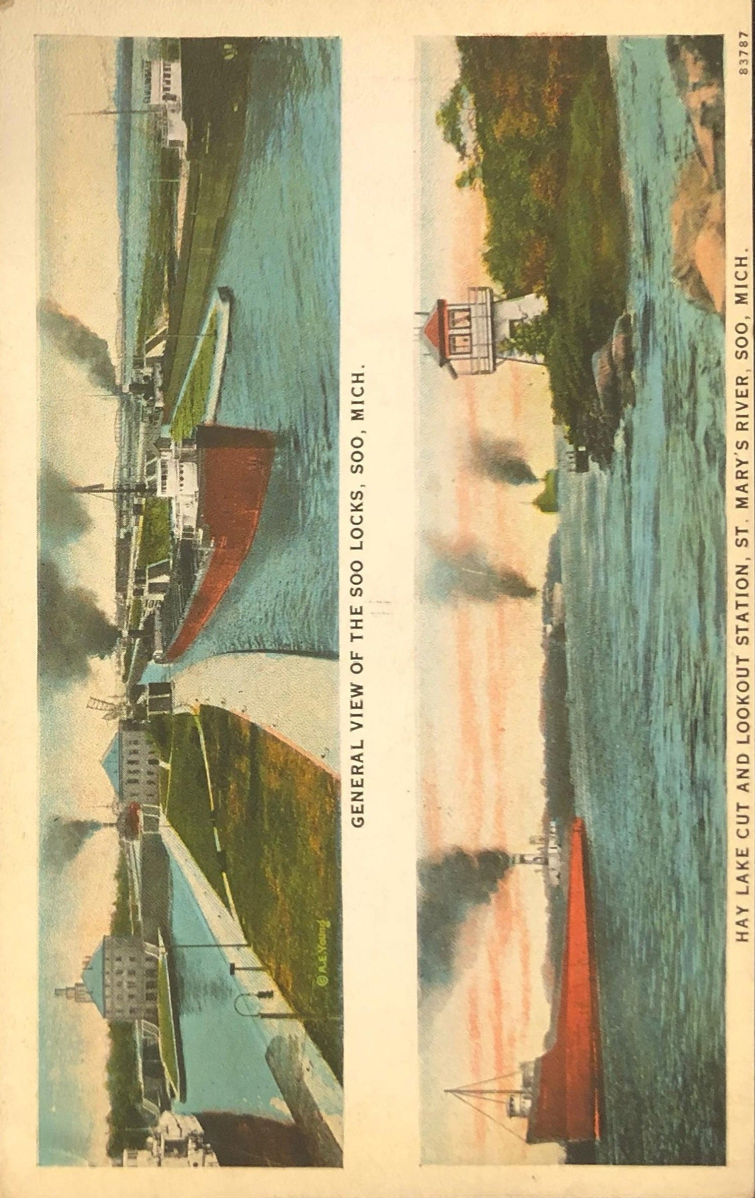 General View of the Soo Locks, Soo, Mich. & Hay Lake Cut and Lookout Station, St. Mary's River, Soo, Mich. Vintage Post Card