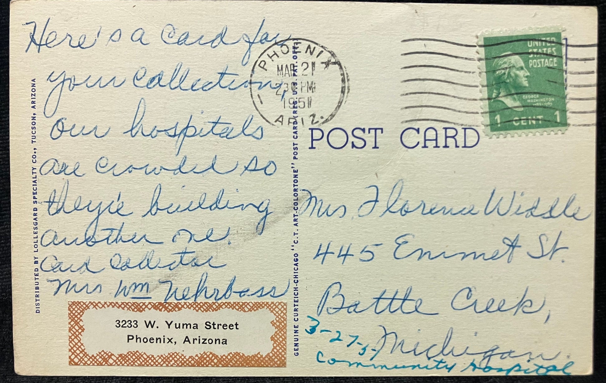 Mailed: Postmark on March 21, 1951 from Phoenix, Arizona with a green one cent George Washington stamp
