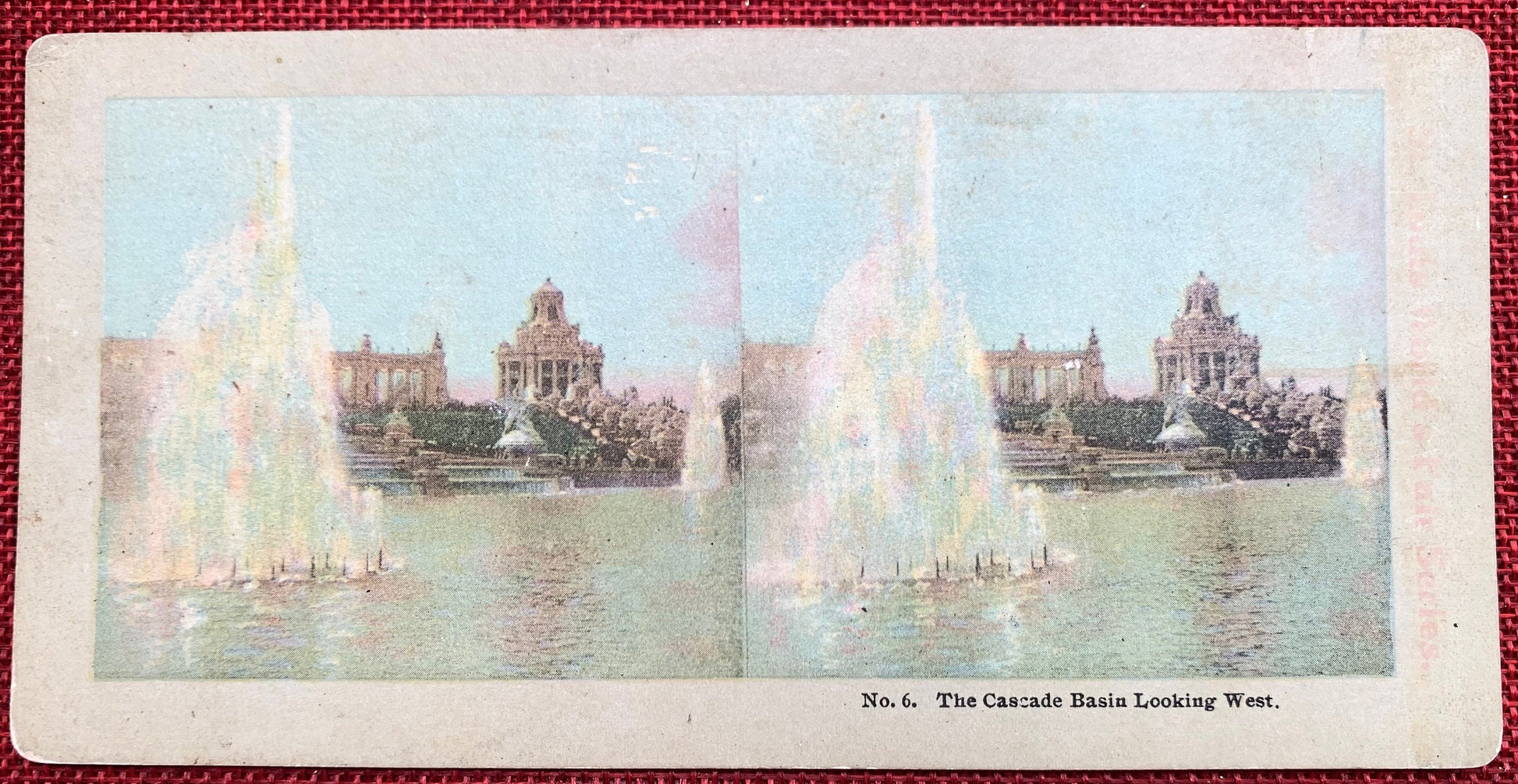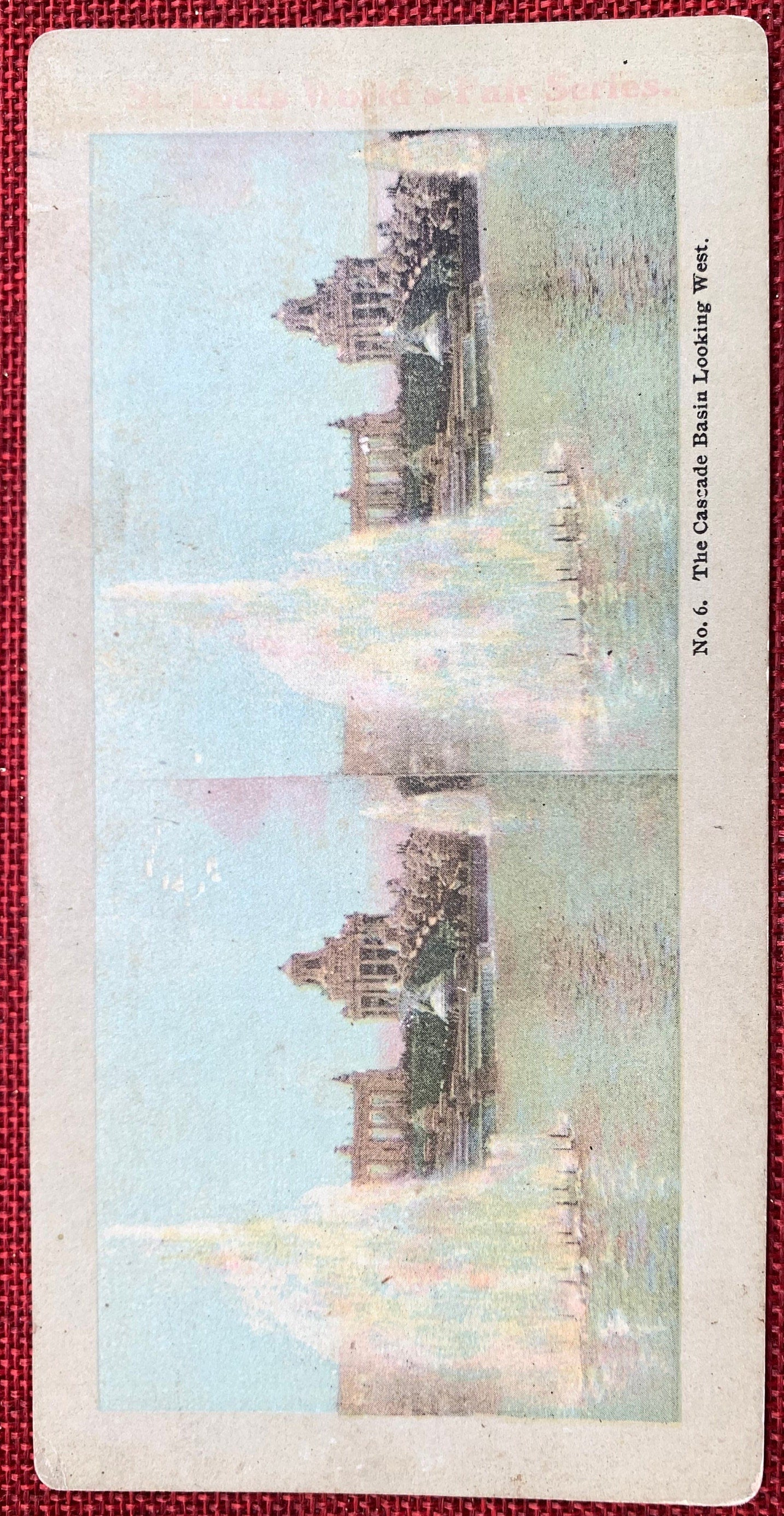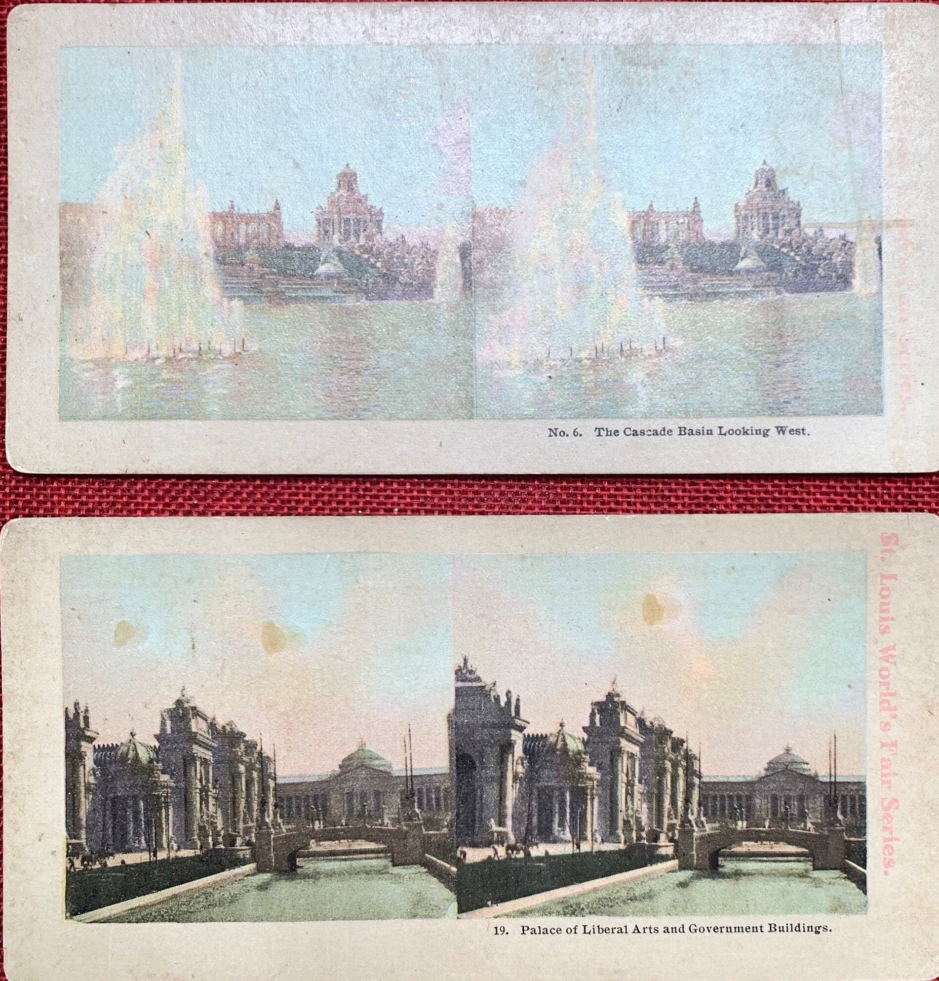 This set of two vintage stereo view card features color images from the St. Louis World's Fair in 1904. The first card has images of a fountain in the Cascade Basin and the second card shows the Palace of Liberal Arts and Government Buildings.