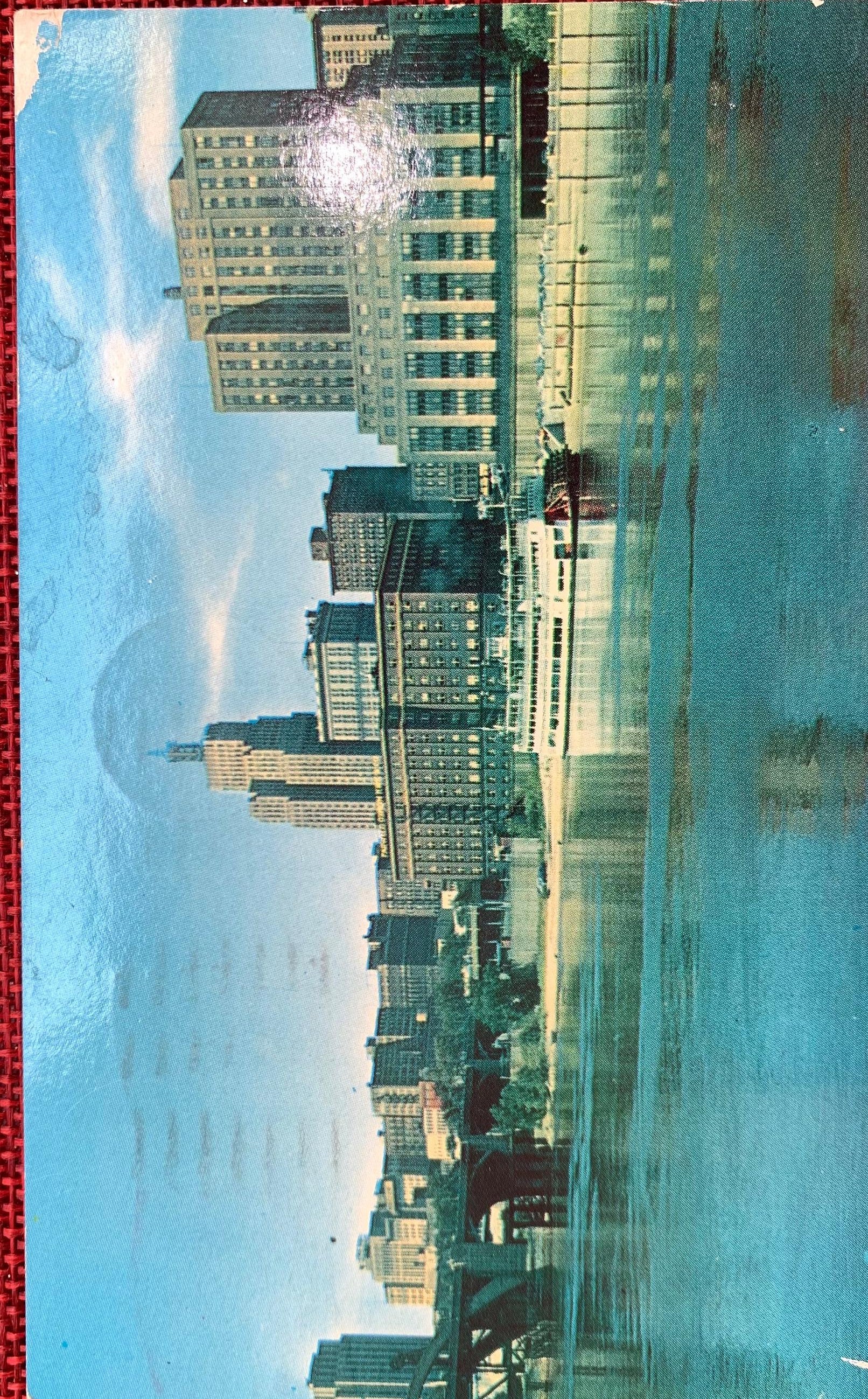 The impressive Saint Paul Skyline, from the Mississippi River, showing Federal Building, right; First National Bank Building in the background and the Courthouse at left. The excursion Steamer "Avalon" at the dock."