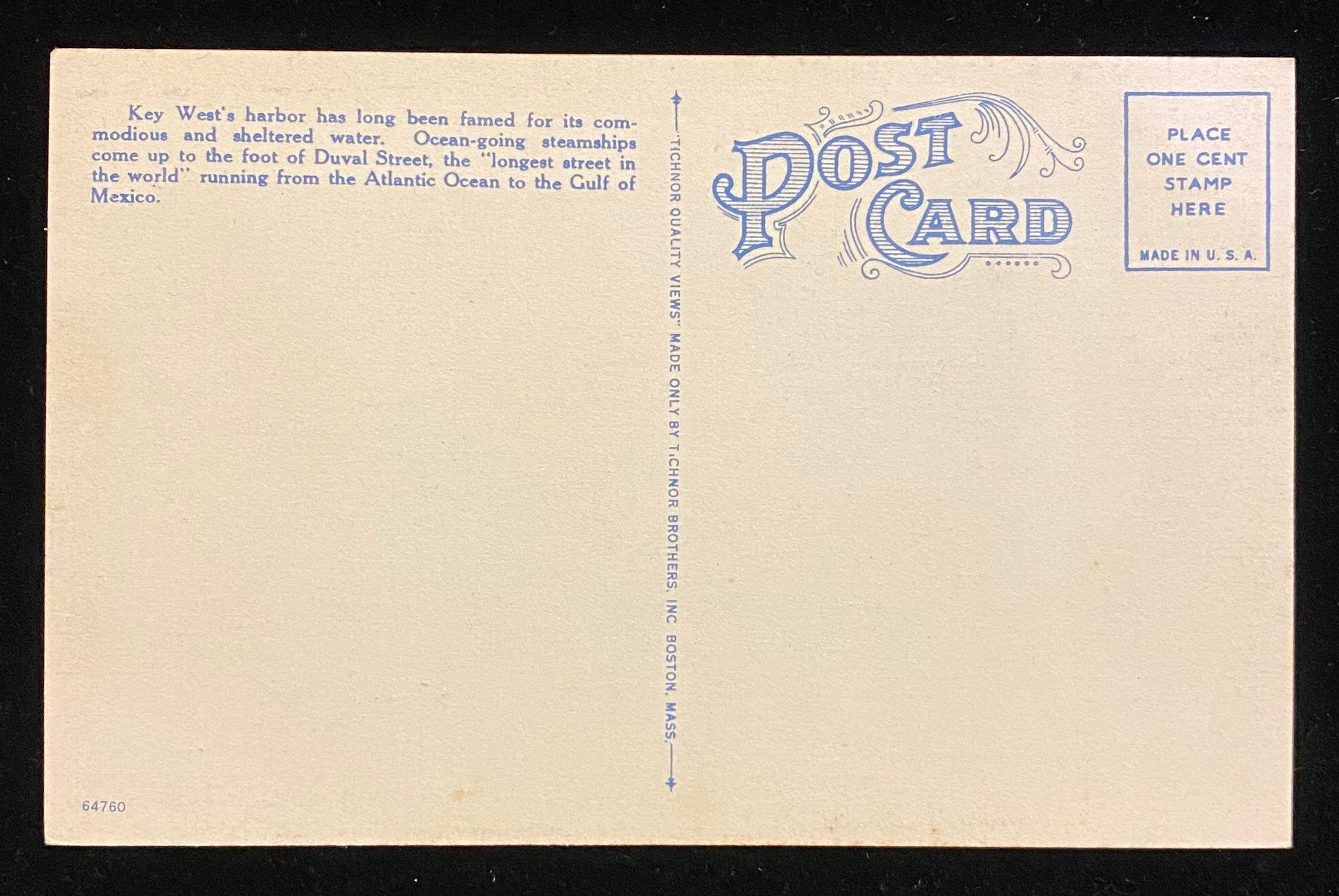Back Information: "Key West's harbor has long been famed for its commodious and sheltered water. Ocean-going steamships come up to the foot of Duval Street, the "longest street in the world" running from the Atlantic Ocean to the Gulf of Mexico."