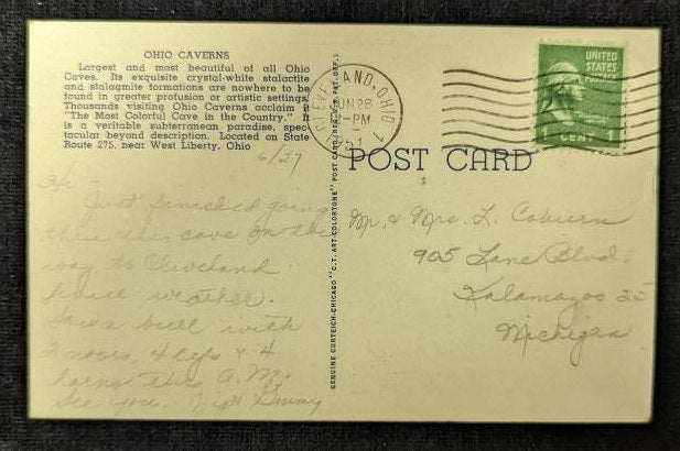 Back: Largest and most beautiful of all Ohio Caves. Its exquisite crystal-white stalactite and stalagmite formations are nowhere to be found in greater profusion or artistic settings. Thousands visiting Ohio Caverns acclaim it "The Most Colorful Cave in the Country." It is a veritable subterranean paradise, spectacular beyond description. Located on State Route 275, near West Liberty, Ohio.