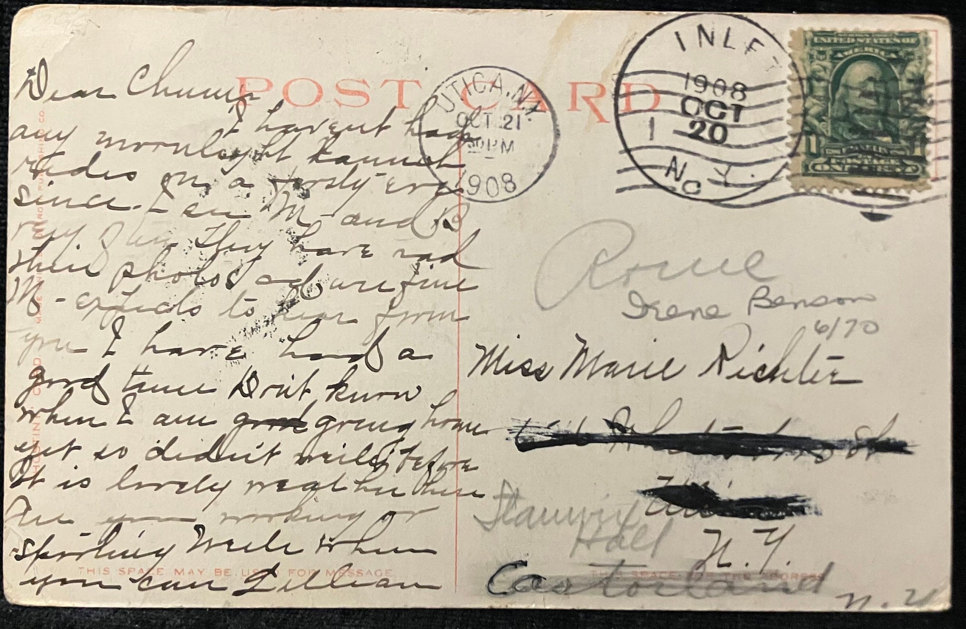 Mailed: Postmark October 21, 1908 from Utica, New York with a green one cent Benjamin Franklin stamp.