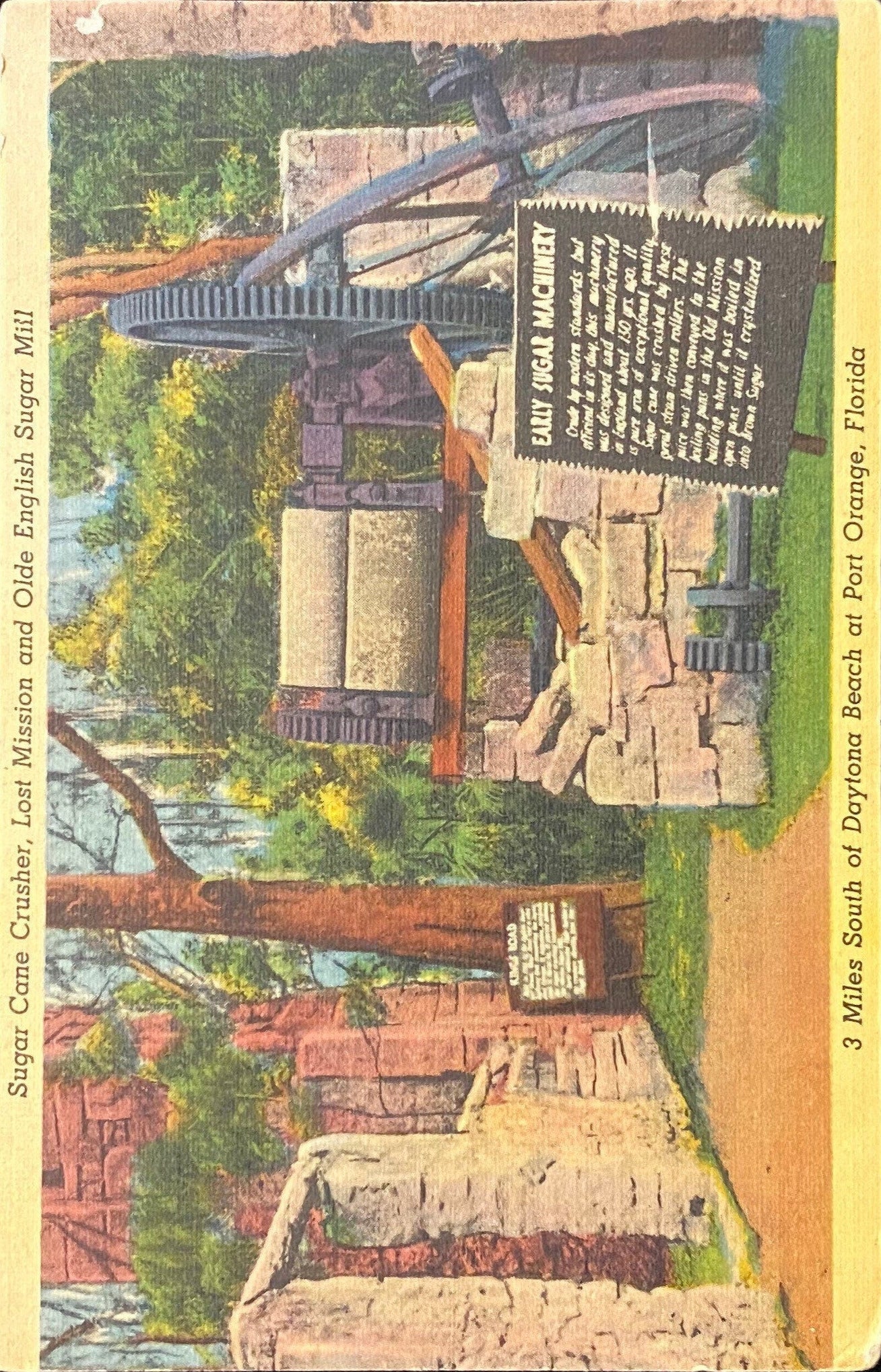 Back Information: "Lost Mission and Olde Sugar Mill Port Orange 3 Miles South of Daytona Beach, Florida. Massive ancient sugar machinery built in England in the early 1800's is one of the many features of the Lost Mission and Olde English Sugar Mill. Of purest high-grade iron, this machinery has withstood elements for more than a century."