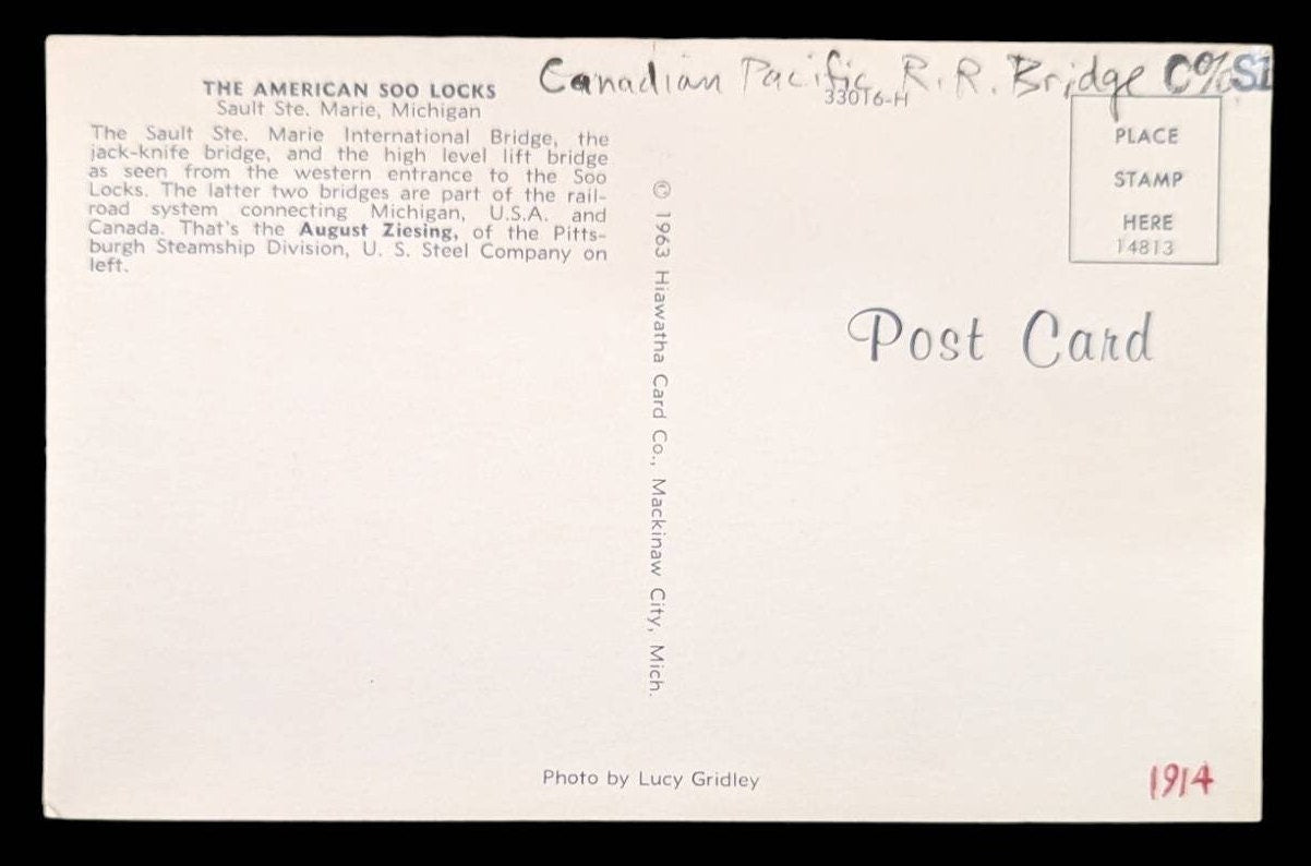 Back Information: The Sault Ste. Marie International Bridge, the jack-knife bridge, and the high level lift bridge as seen from the western entrance to the Soo Locks. The latter two bridges are part of the railroad system connecting Michigan, USA and Canada. That's the August Ziesing, of the Pittsburgh Steamship Division, U.S. Steel Company on left.