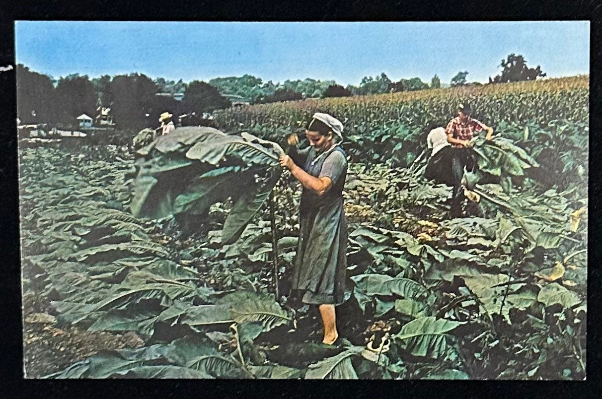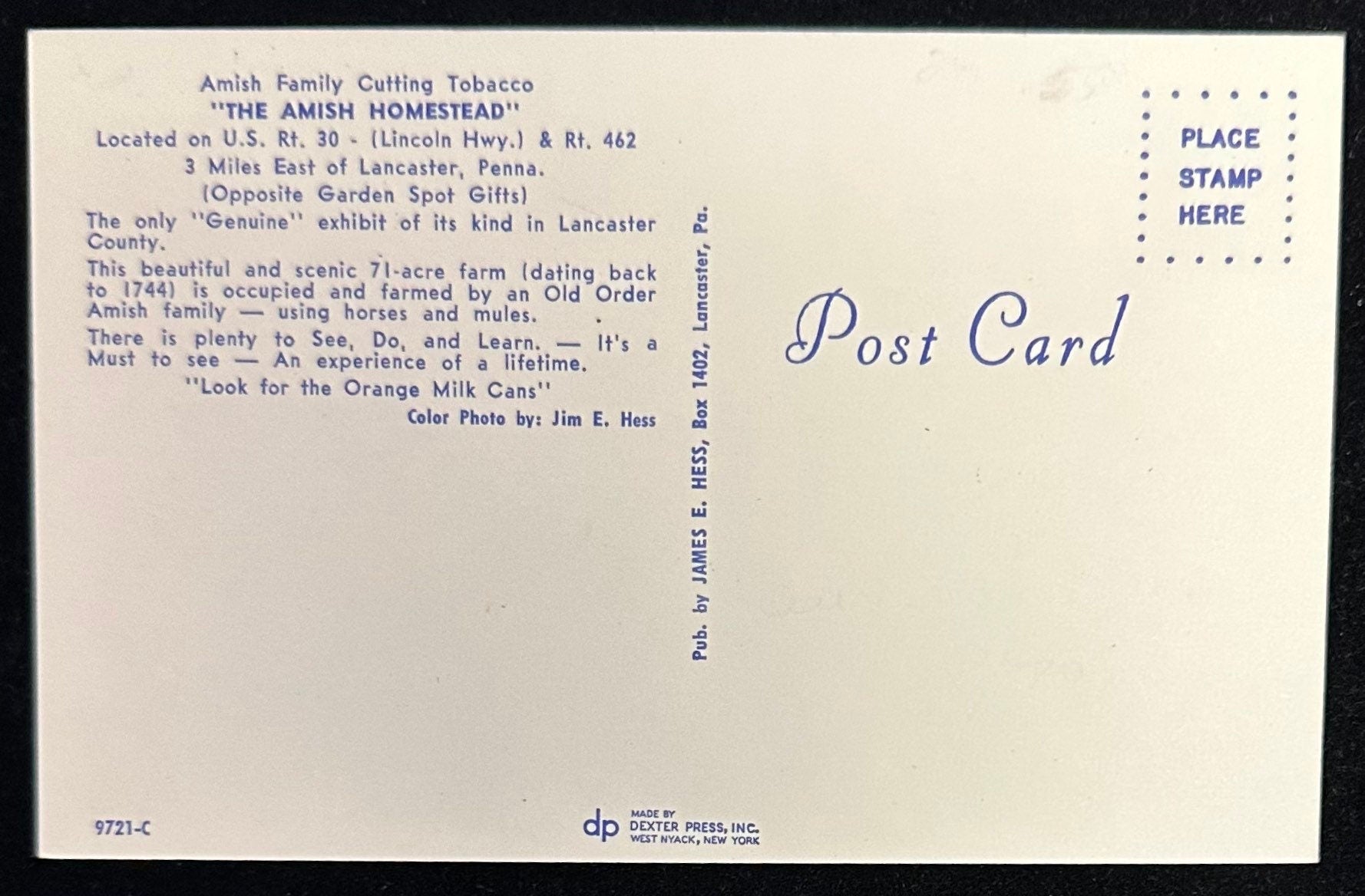 Back Information: Amish Family Cutting Tobacco. “The Amish Homestead” is located on US Rt 30 - (Lincoln Hwy) & Rt. 462. 3 Miles East of Lancaster, Penna. (Opposite Garden Spot Gifts) The only “Genuine” exhibit of its kind in Lancaster County. This beautiful and scenic 71-acre farm (dating back to 1744) is occupied and farmed by an Old Order Amish family - using horses and mules. There is plenty to see, do, and learn.- It’s a must to see- An experience of a lifetime. “Look from the Orange Milk Cans” Color Photo by: Jim E. Hess