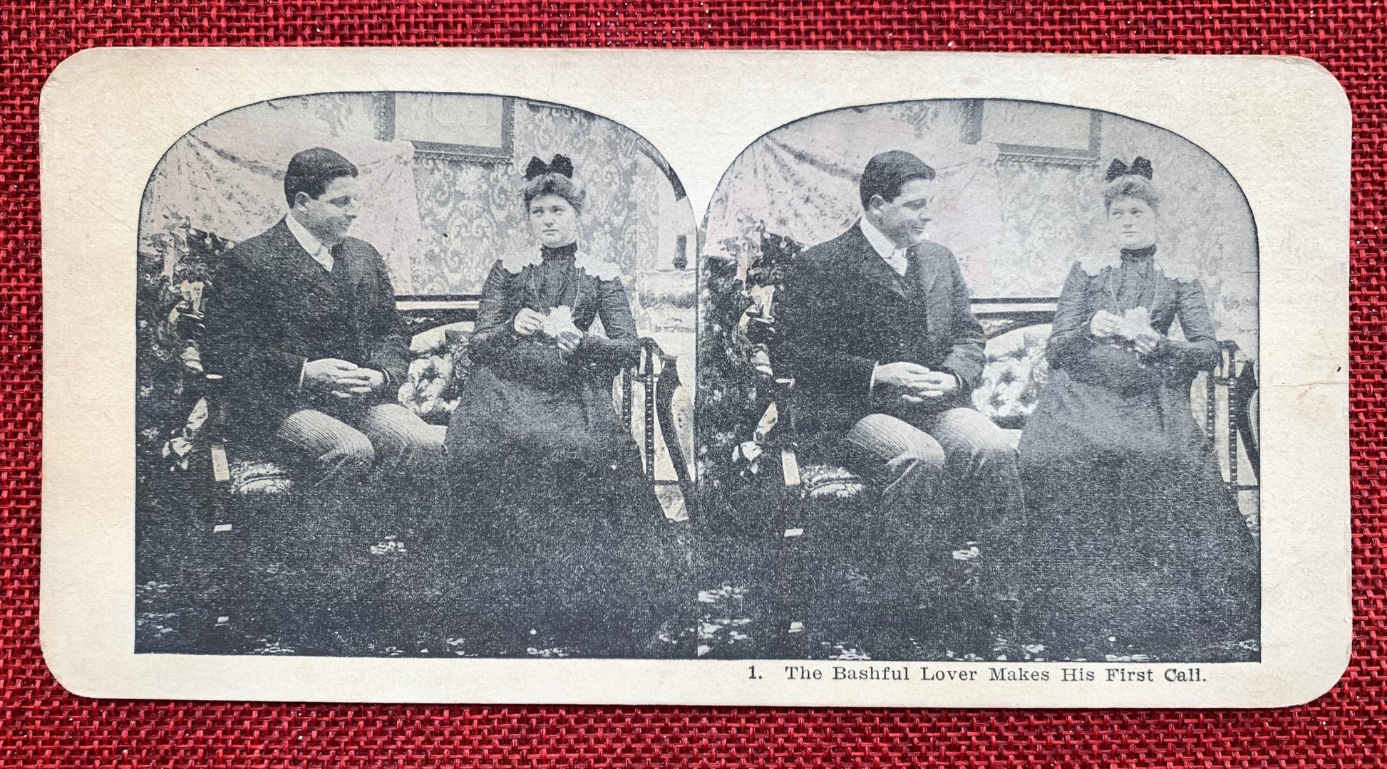 The Bashful Lover Makes His First Call - Stereo View Card, Late 1800s/Early 1900s, Couple Sitting on a Couch, Woman Looking at Man Skeptically