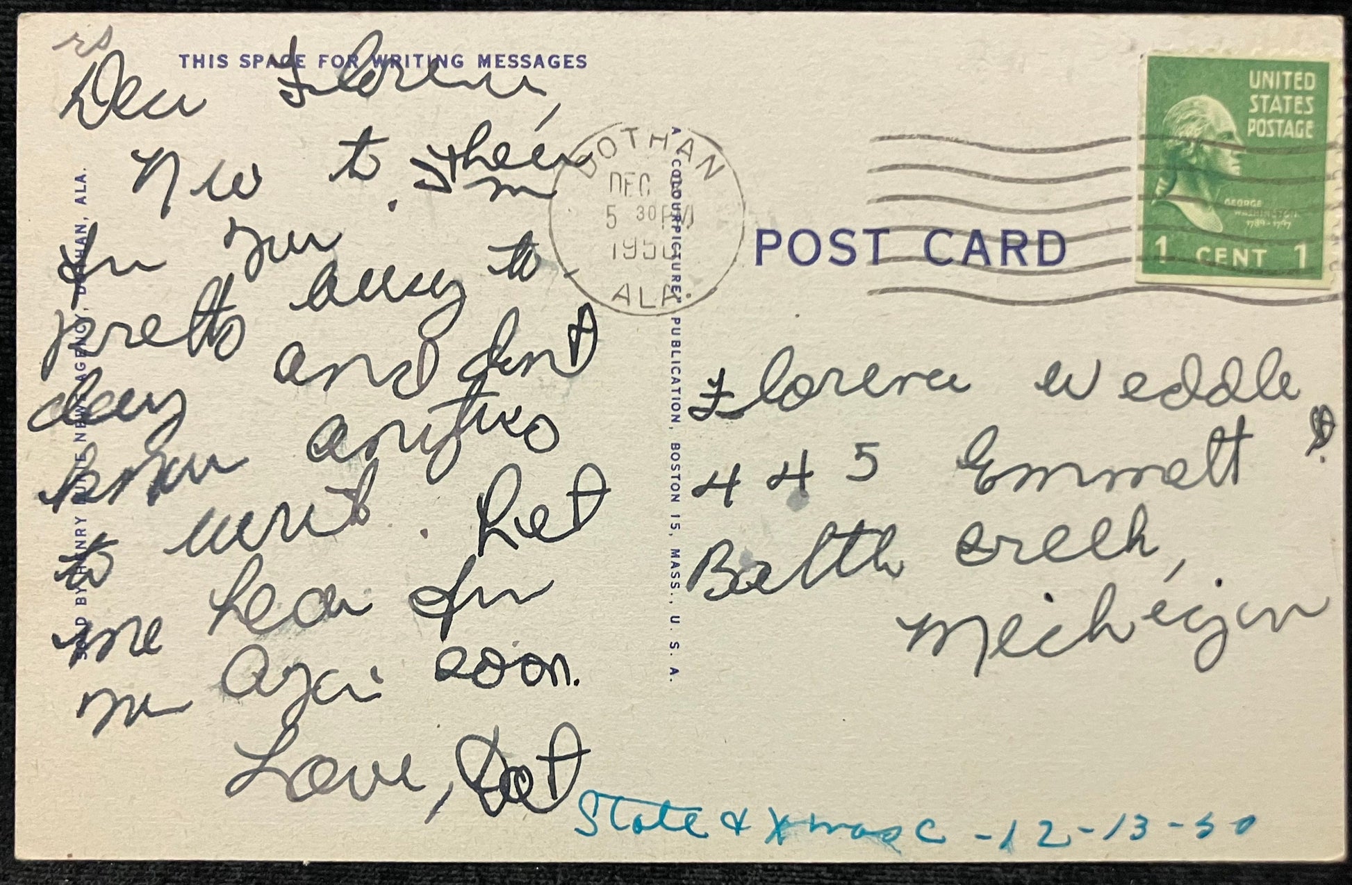 Mailed: Postmark on December 8, 1950 from Dothan, Alabama with a green one cent George Washington stamp