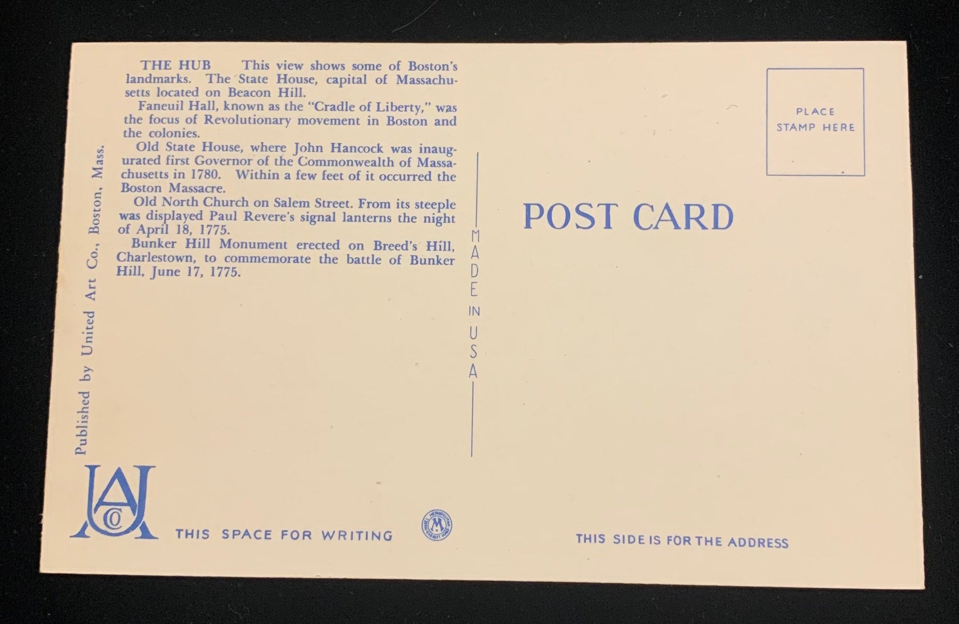 Back: This view shows some of Boston's landmarks. The State House, capital of Massachusetts located on Beacon Hill. Faneuil Hall, known as the "Cradle of Liberty", was the focus of Revolutionary movement in Boston and the colonies. Old State House, where John Hancock was inaugurated first Governor of the Commonwealth of Massachusetts in 1780. Within a few feet of it occurred the Boston Massacre. Old North Church on Salem Street. From its steeple was displayed Paul Revere's signal lanterns the night of April 18, 1775. Bunker Hill monument erected on Breed's Hill, Charlestown, to commemorate the battle of Bunker Hill, June 17, 1775
