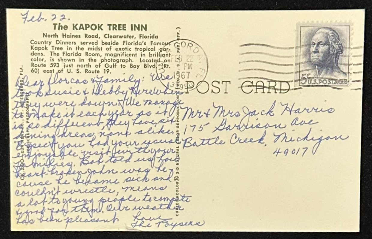 Mailed: Posted on February 22, 1967, from Punta Gorda, Florida with a 5 cent George Washington stamp