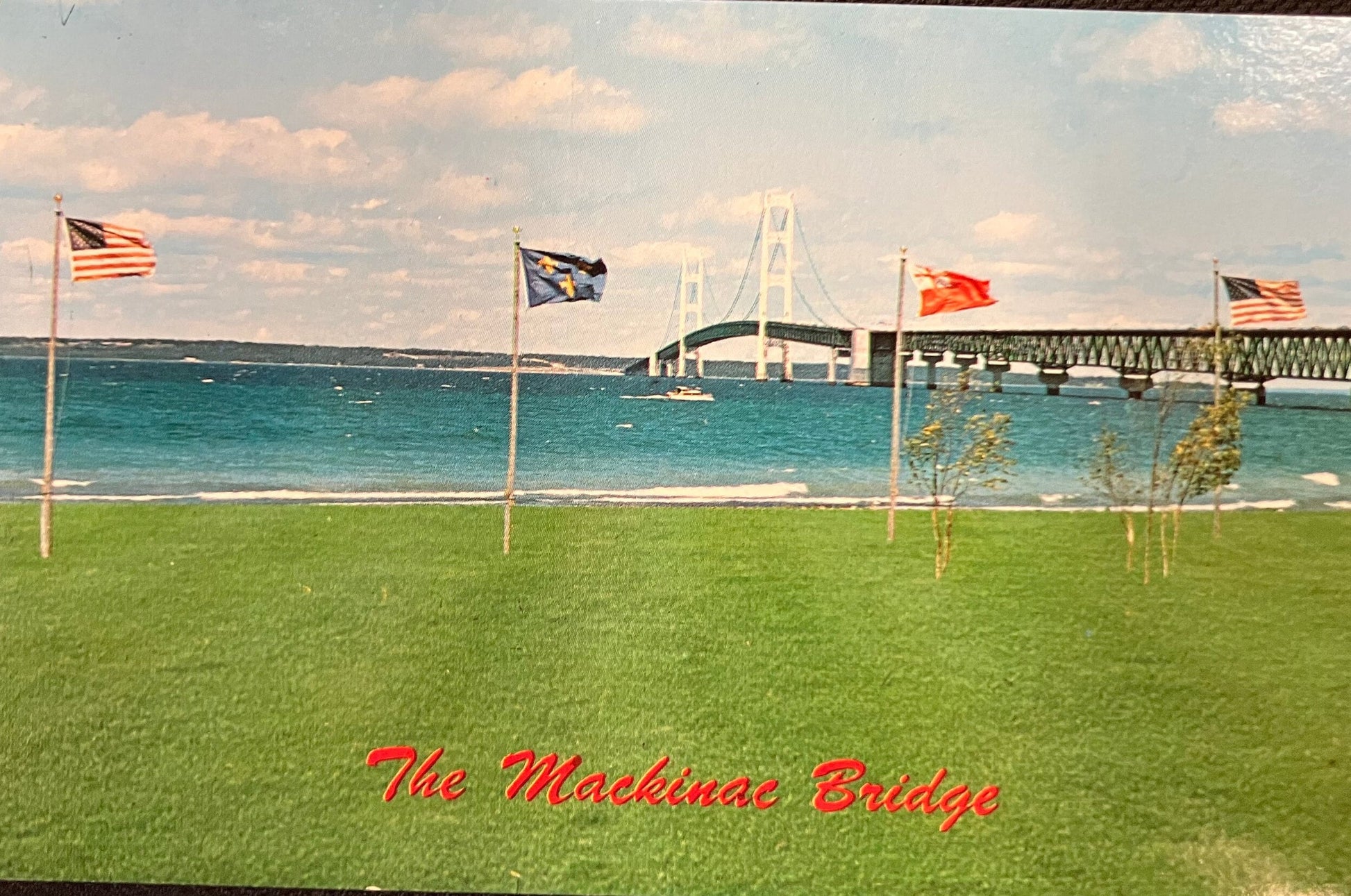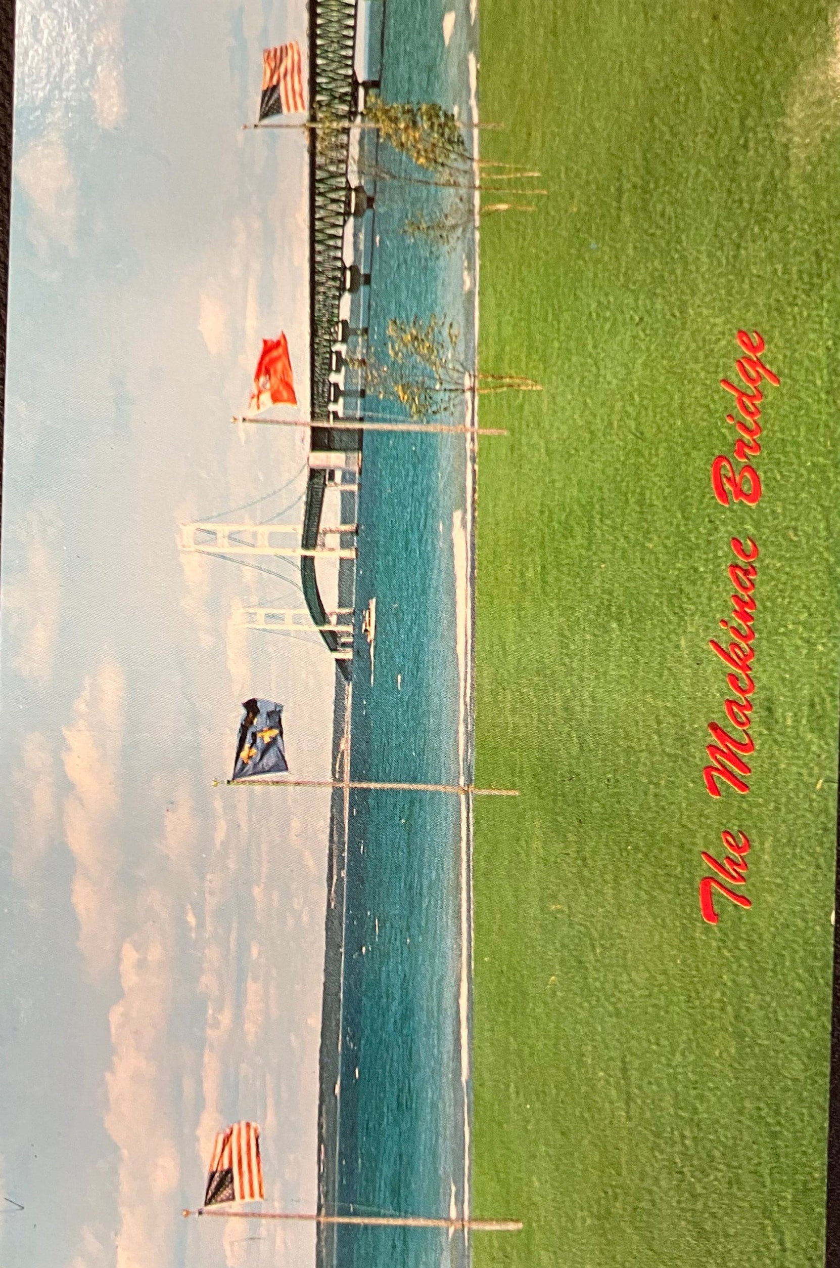 On Front: A photo of the Mackinac Bridge in the distance. There are 2 American flags and between them are the French Fleur De Lis and English Red Ensign Flag